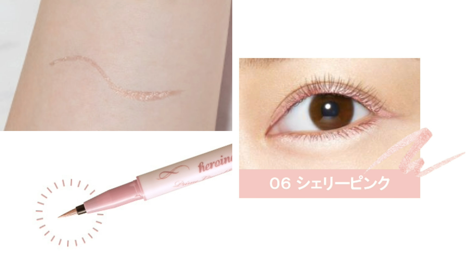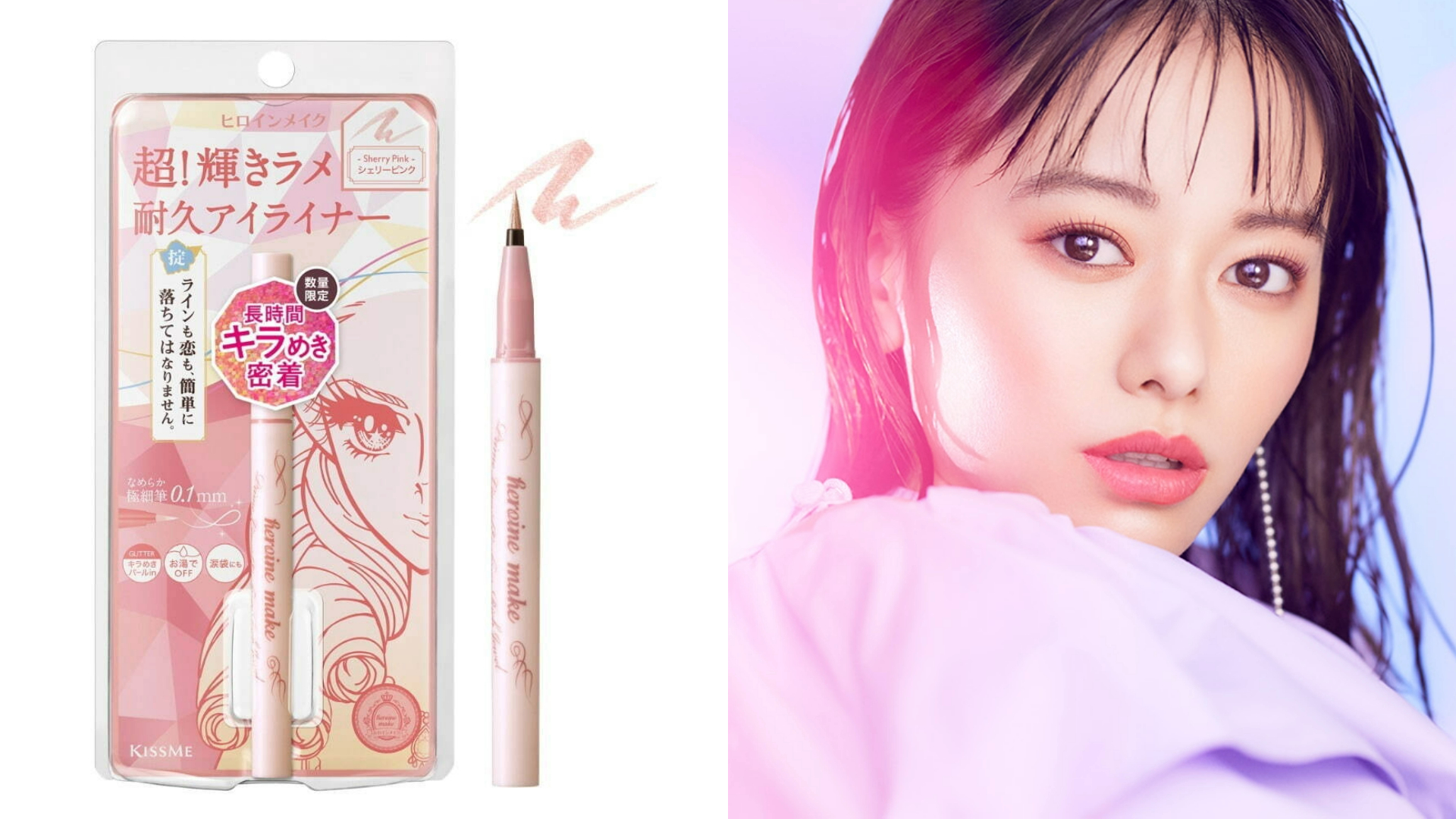 KISS ME超人氣的鑽光系雪莉粉色在今年隆重再版!超持久極細抗暈眼線筆擁有0.1mm極細超柔軟彈力筆頭,細緻柔滑能輕鬆劃出各式線條。品牌獨創超持久配方,能長時間持妝不暈染,並添加6種美容液成分,呵護眼部肌膚。液態速乾的筆液勾勒出精緻有神的眼褶輪廓,珠光亮片綻放如鑽石般高級感光芒,增添時尚質感並打造精緻潮流雙眸形象。