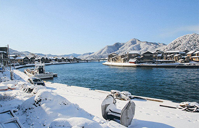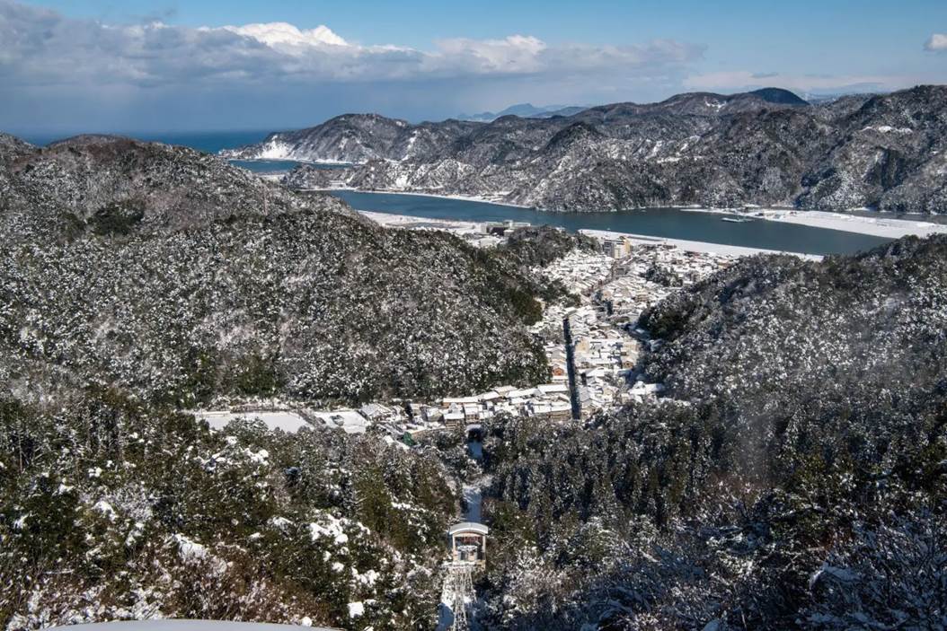 自城崎溫泉只有一站之隔的「竹野海岸」,清澈透明的海水也被評選為日本海水浴場百選之一。冬季竹野海岸周遭圍繞的潔白山脈,映襯著湛藍的海水,為冬季最靜謐的風景。沿著海岸邊散步,沿途還可見白雪覆蓋的傳統燒杉板建築街景,感受別有風味的懷舊景色。除了海邊散步,還可至當地知名的竹野展望台Jaja山上,一覽兵庫最北端的貓崎半島,堆積的沙洲更連繫起兩地,雪白沙洲與海景也是冬季獨特的景致與看頭。