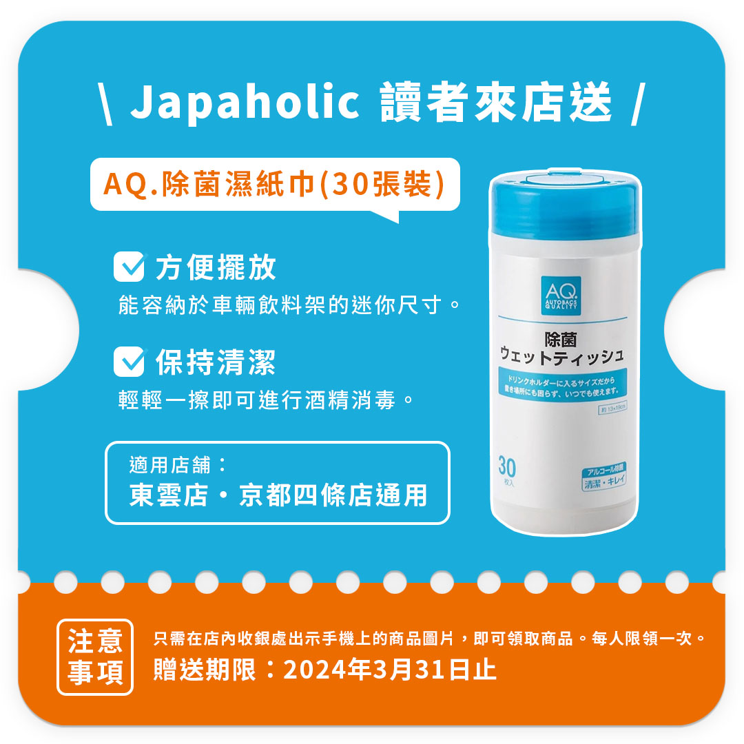 即日起至2024年3月31日止,只要在A PIT AUTOBACS東雲店/京都四條店出示以上優惠券給櫃檯人員,就可以免費獲贈一個AQ.(AUTOBACS QUALITY )罐裝除菌濕紙巾!特別設計成可以放在車上飲料架的尺寸,非常方便。請大家去逛A PIT AUTOBACS的時候,別忘了領取這個Japaholic讀者專屬的小禮物!