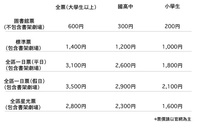 角川武藏野博物館雖然沒有攝影的限制,但是入場需要購買門票。票價主要分為四種:圖書館票、標準票、全區一日票與晚鳥票,每一種的票價與可使用的時間、範圍皆有不同: