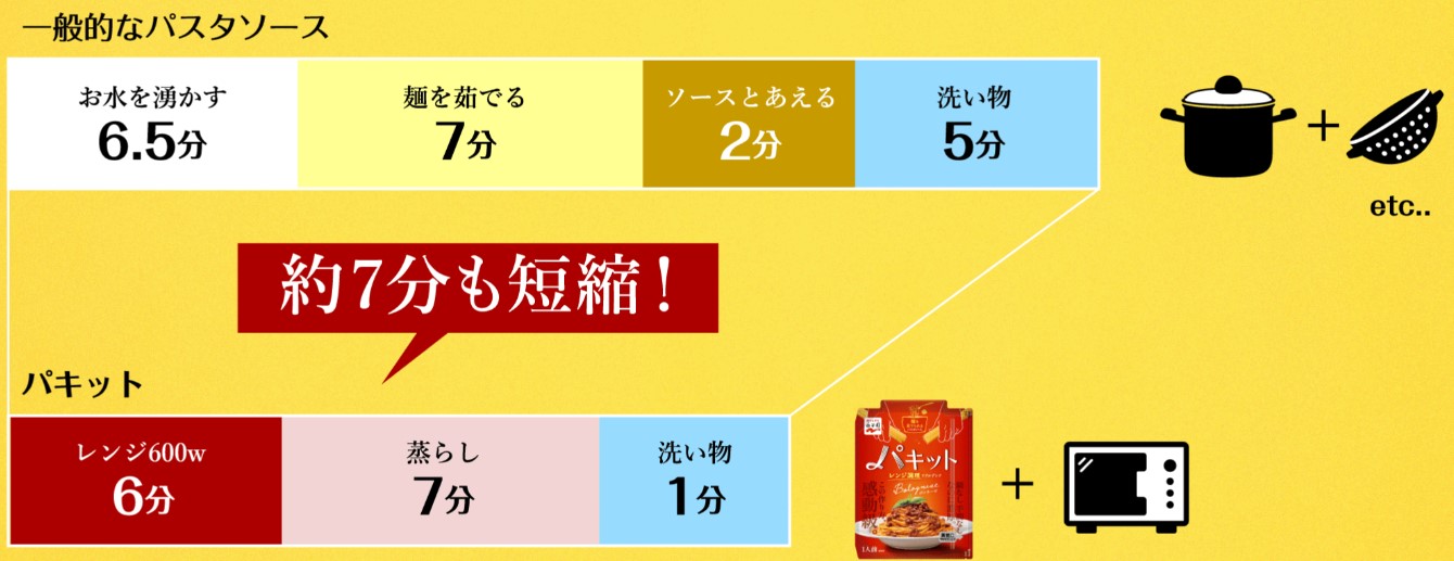 優秀的商品開發總記得要從解決客人問題的角度來切入,於是Pakitto以「透過微波爐來同時烹調麵條和義大利麵醬」為概念,成功開發出展現時間運用效率的新形態烹調方法。