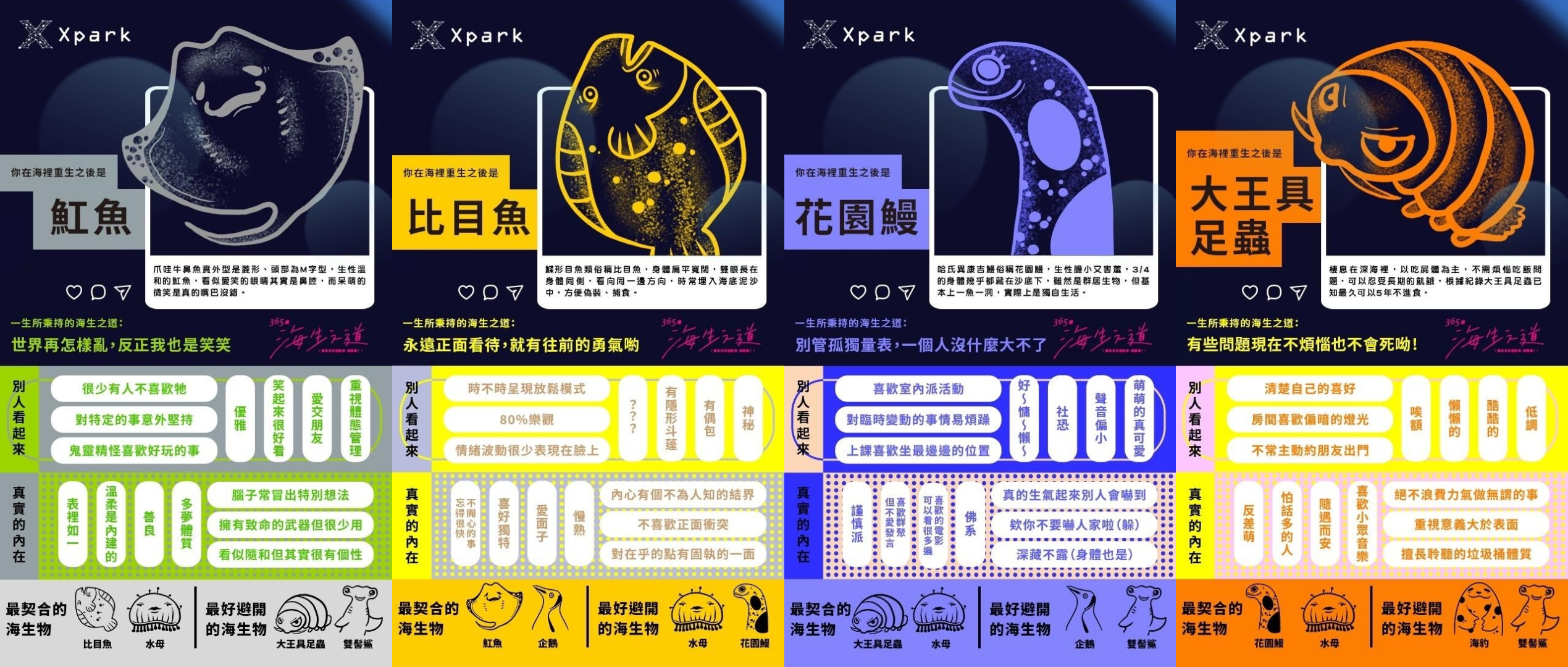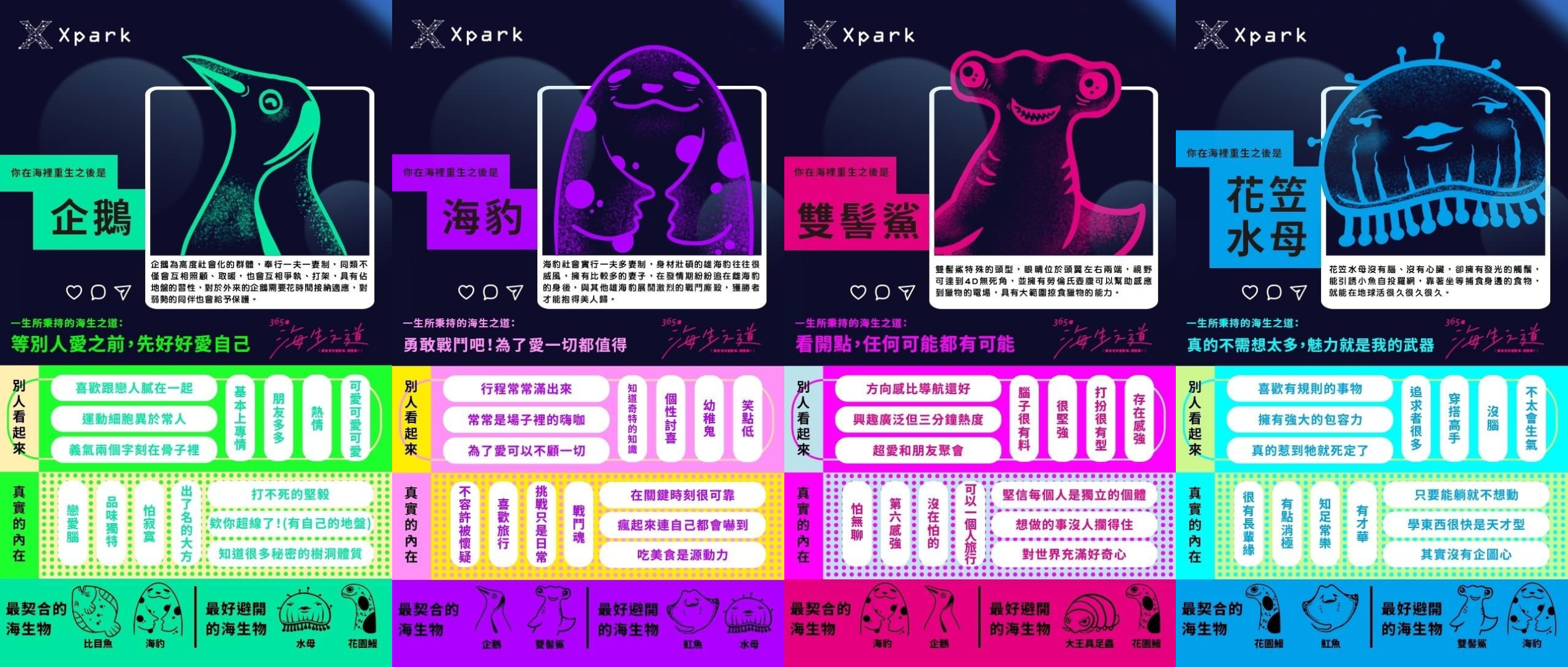 逛完Xpark可不能空手而歸,伴隨活動登場的心理測驗當然是一定要來玩的,到Xpark活動網站上來一場海洋冒險心測,測出代表你的海生生物,令人莞爾的超萌動物以及超準分析絕對不能錯過!