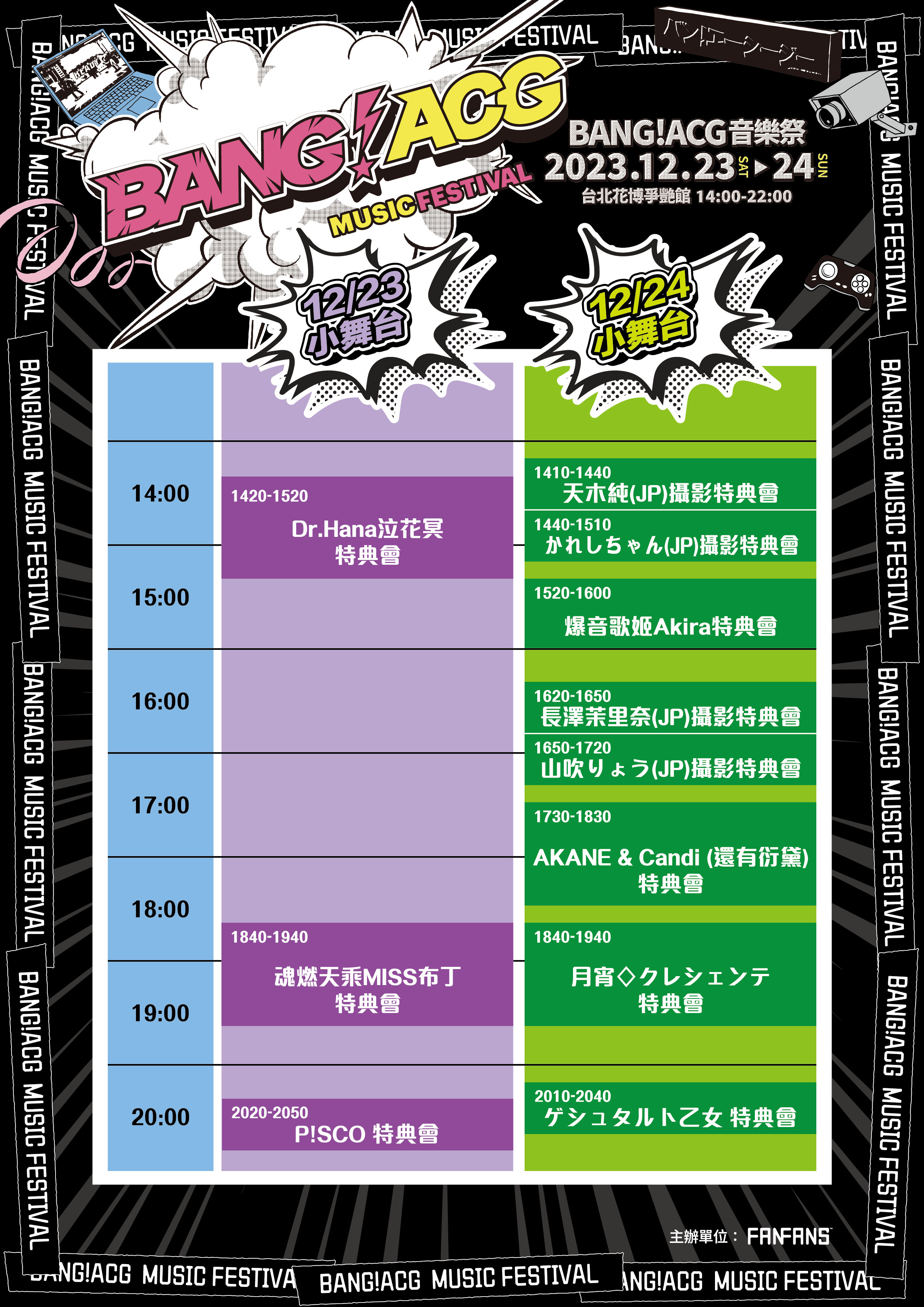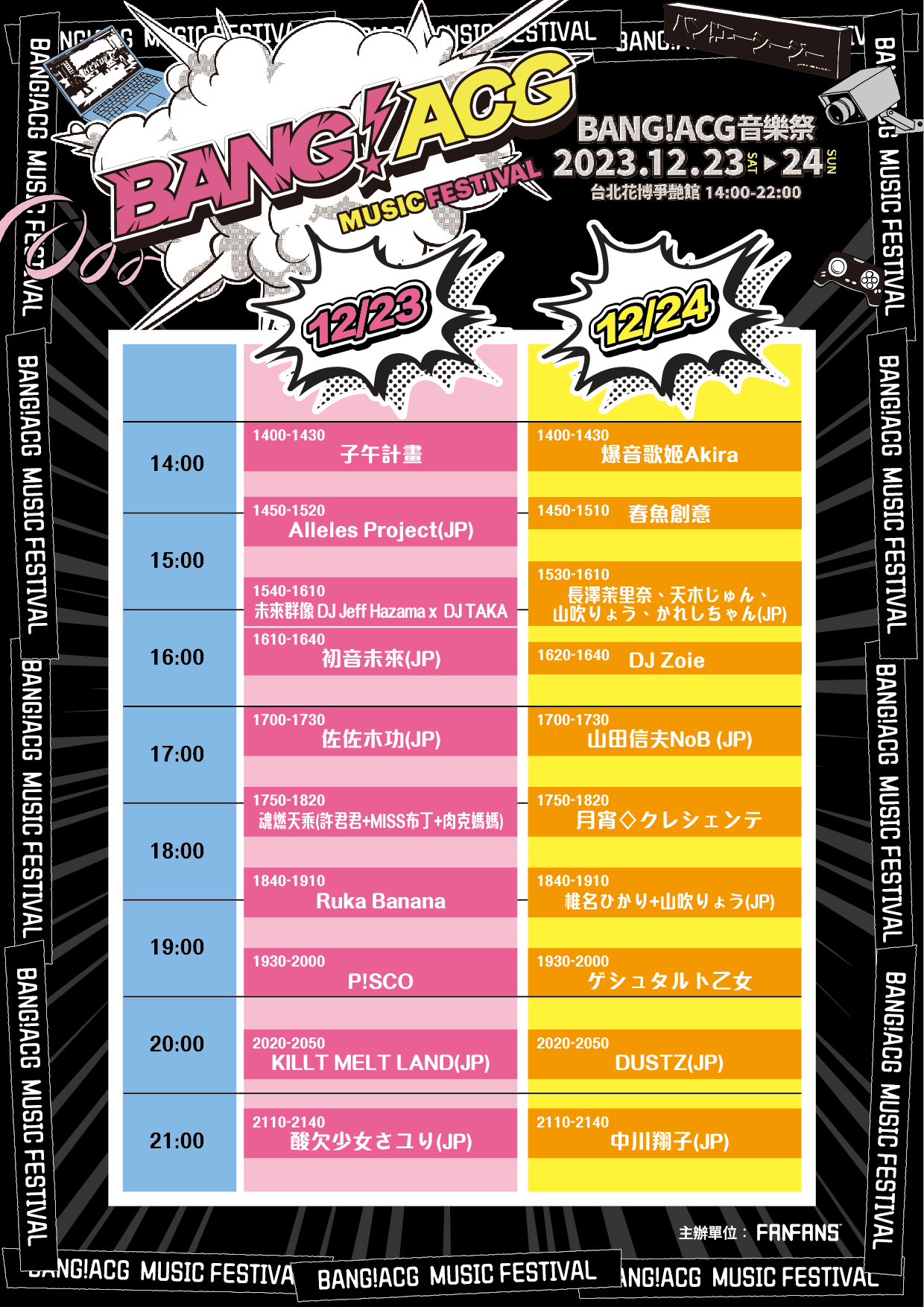 首屆集結日台動漫歌手、藝人團體、Coser和虛擬歌手偶像的「BANG!ACG」音樂祭,觀眾區分為一般「波紋區」和搖滾區「爆炎區」,火熱販售ing的預售票也在最後倒數中,剩餘數量不多,大家趕快把握最後機會,一起來圓山花博,度過最熱血的聖誕節吧!