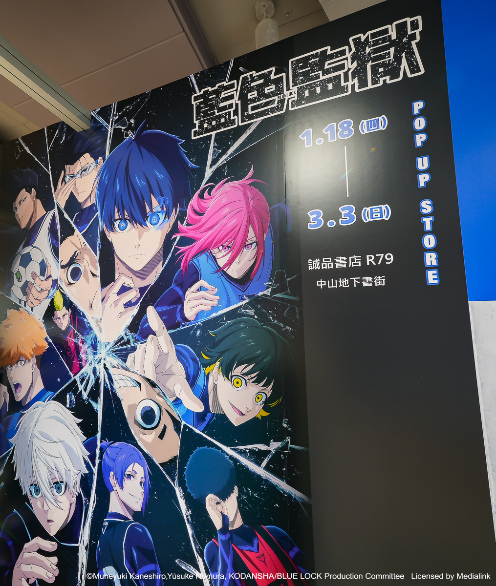 由香港羚邦集團官方授權,全台第一間藍色監獄快閃店1月18日-3月3日登場誠品R79中山地下書街!藍色監獄是第45屆「講談社漫畫獎少年部門」得奬作品,不只被評價為最瘋狂的足球漫畫,劇場版也即將在日本上映,粉絲們趕快先來快閃店複習一下劇情吧!六大拍照打卡點首推整面有著十三位球員的「主角群打卡牆」,還有可以看到擁有真摯友情的潔世一與蜂樂迴「最佳拍檔區」也不能錯過,最後必拍的就是以潔世一為首共同在藍色監獄訓練的八位「最強前鋒區」,拍好拍滿才是真粉絲!快閃店現場更推出超過七十款全新周邊商品,超酷炫的潔世一「LED壓克力小夜燈」、還有想通通收藏的八款「角色立牌」和每天背都不膩的「造形肩背袋」都好想買啊!單筆消費滿$1500就可獲得限量800份的金屬L夾,共有四款設計,隨機贈送,送完為止,粉絲們先搶先贏啊!