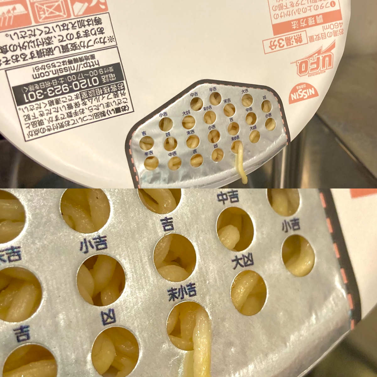 而這次創意就是源自於「將熱水倒出」的這個步驟。相信有吃過日清炒麵的人都知道,在將麵煮熟並倒出熱水時,在炒麵的包裝上有非常貼心地留下一個「瀝湯口」方便將熱水倒出,但缺點是偶爾也會有麵條從這個瀝湯口跑出來。而日清食品這次則是反過來利用了這點,打趣地將每個瀝湯口都標註不同的運勢,讓人可以由瀝湯口跑出來的麵條來評估今日的運勢如何。
