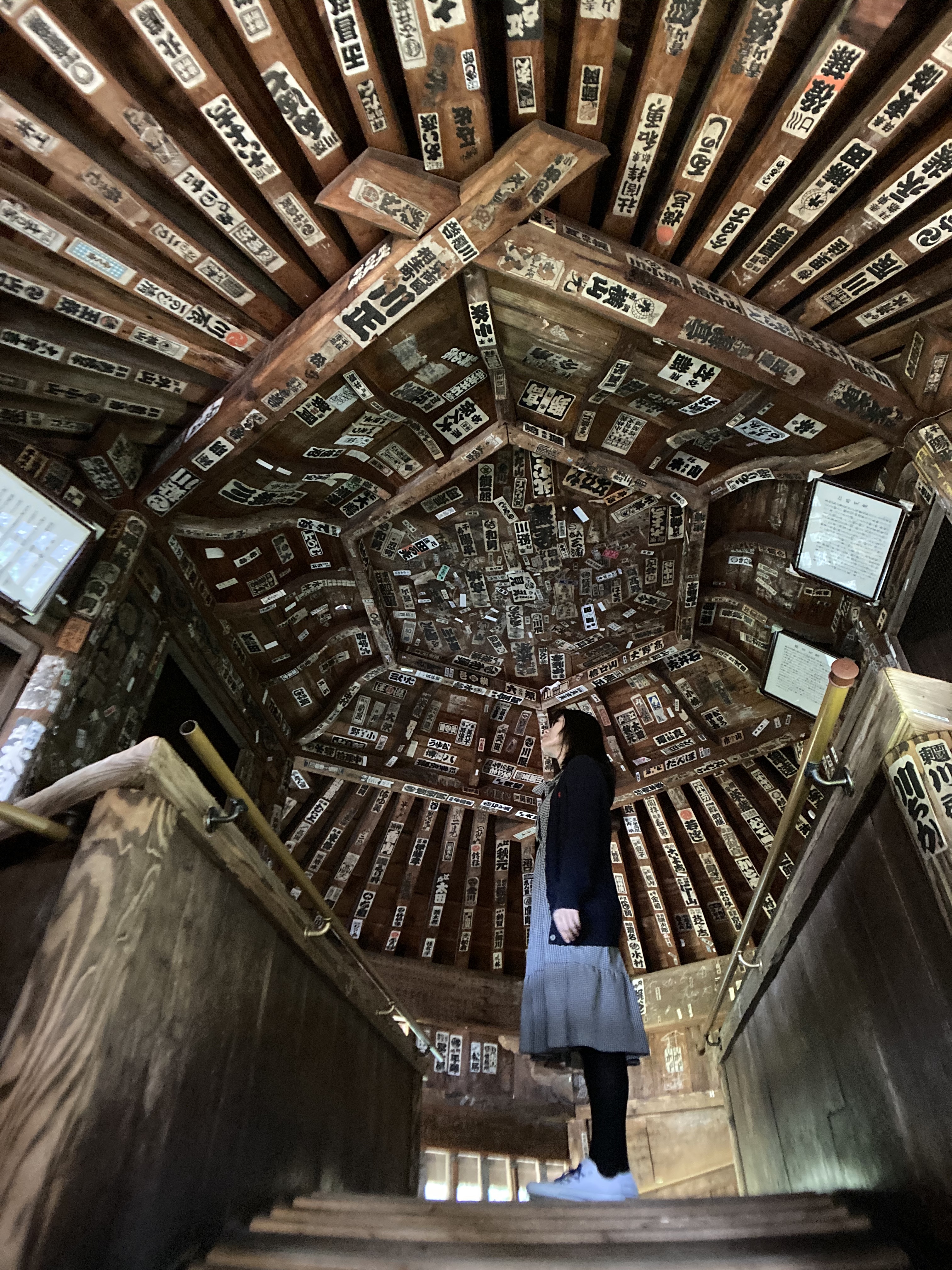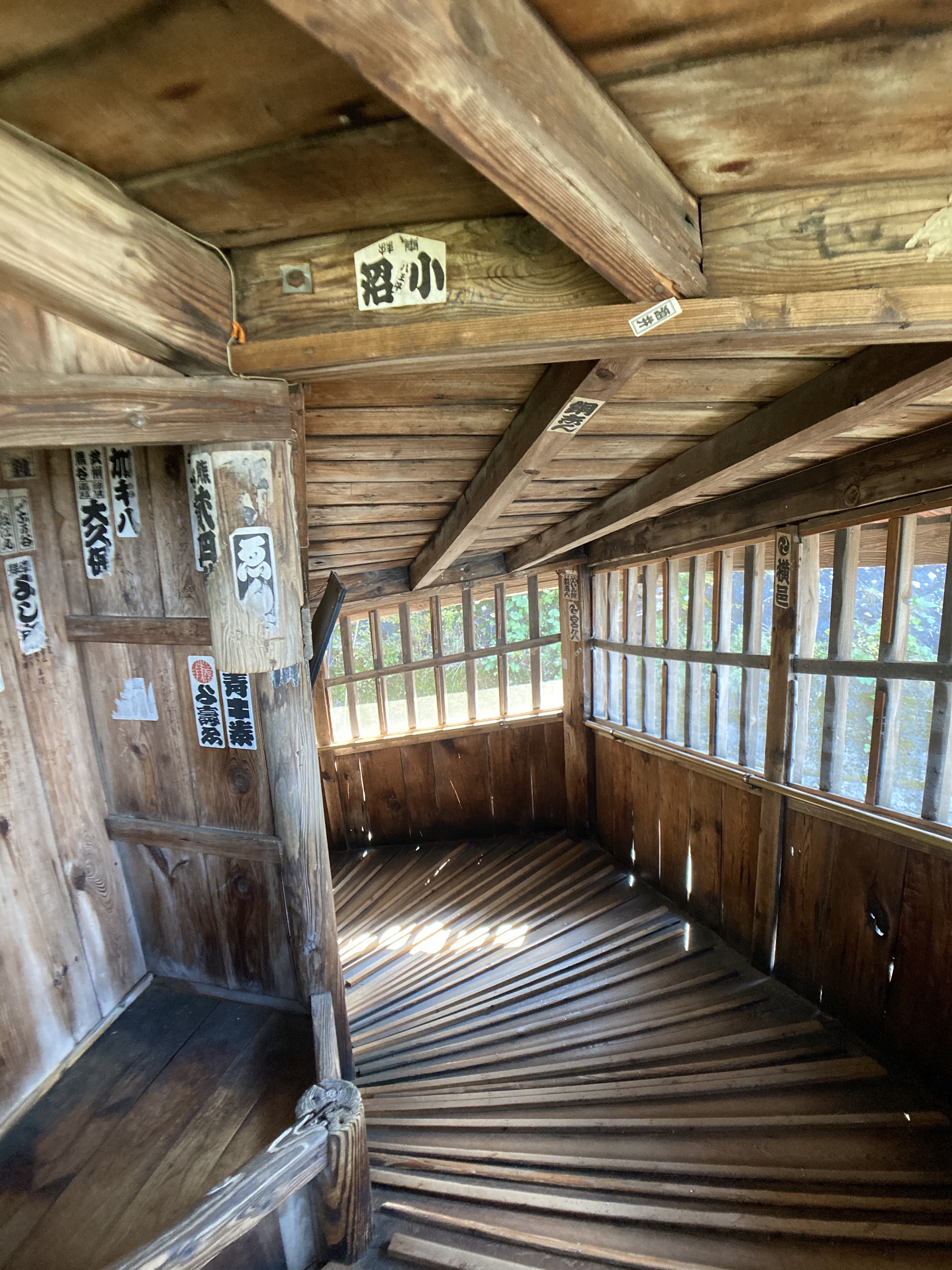 進入入口後,往左邊隨著斜坡道順行而上,陽光透過透過傾斜窗戶打入室內,呈現的光影變化與建築內四處張貼的貼紙*相映成趣,加上建築內部散發出的木頭味道,讓人在視覺及嗅覺上都可以感到建築物傳來的歷史感,而踏在木板上傳來的嘎嘎聲,彷彿也在訴說著它在這兩百多年裡佇立於此的歲月故事。