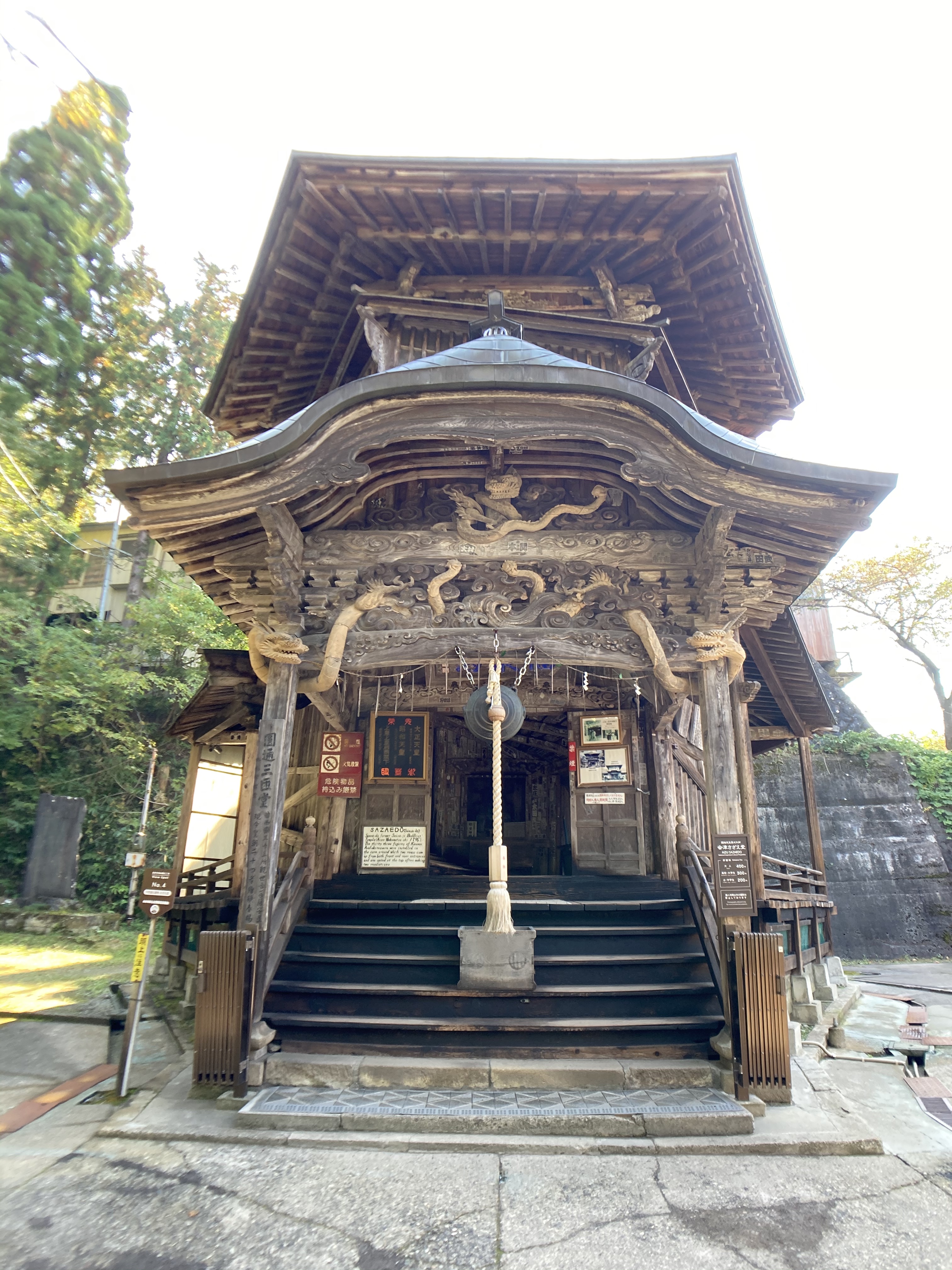 前往蠑螺堂需要先爬上155階的石梯,或是選擇搭乘付費的手扶梯,一人的價格是250日圓,搭到最上層只需要走路一分鐘就可以到達蠑螺堂,不過下山就只能認命爬樓梯了。飯盛山雖然海拔不高,但還是可以俯瞰整個會津若松市,當年白虎隊的少年武士們就是在此遠眺到因為被猛烈炮火襲擊而被黑煙環繞的鶴城,誤以為會津城已經戰敗,於是集體在此切腹自盡。