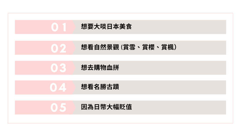 排名第五的理由則是日幣大幅貶值,這也讓原本較高的日本物價相對沒那麼高了,以上哪些原因和你的考量一樣呢?