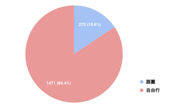 問卷中有高達8成讀者都是自由行,而少數15%的人選擇跟團。可以看見台灣旅客依然多半都是自己安排自由行。根據讀者摘要顯示,近年在自由行之中加入一日跟團行程的複合型態也很受歡迎,自由度高也有很多選擇多,也更容易讓旅人前往一些大眾交通比較難以抵達的地方。