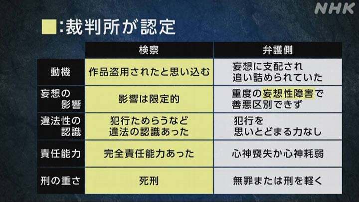 辯護方則主張被告當時因為被妄想支配,精神上已經嚴重耗弱,既無法區分善惡,也沒有停止犯行的能力,希望能判處無罪或從輕量刑。