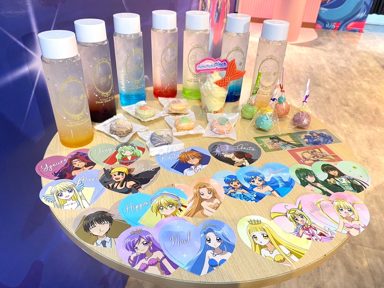 本次期間限定店,帶來以七位美人魚的代表色設計的七款不同顏色及口味的瓶裝氣泡飲,每瓶飲料都會使用主題限定瓶子。另外來店消費任一飲品就送《真珠美人魚》角色杯墊乙張(共18款隨機發送、恕不挑款),趕快來蒐藏吧。