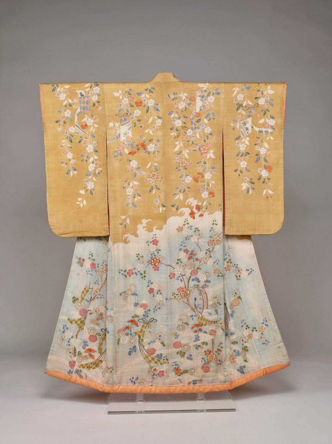 大家有穿過振袖嗎?這是一種袖子會下垂到一公尺左右的和服,在現代多用於年輕女性的成人式及結婚式。而此次展出,同樣是從江戶時代傳承下來的《振袖 染分縮緬地枝垂桜菊短冊模様》就有著十分獨樹一幟且優雅的設計。在女性穿上後,上頭的枝垂櫻就會隨著布料,像是從穿著者的肩膀垂下一般,讓下垂的振袖設計和上頭的枝垂櫻的特色完美的結合,彷彿讓人披戴著一棵櫻花樹似的。。