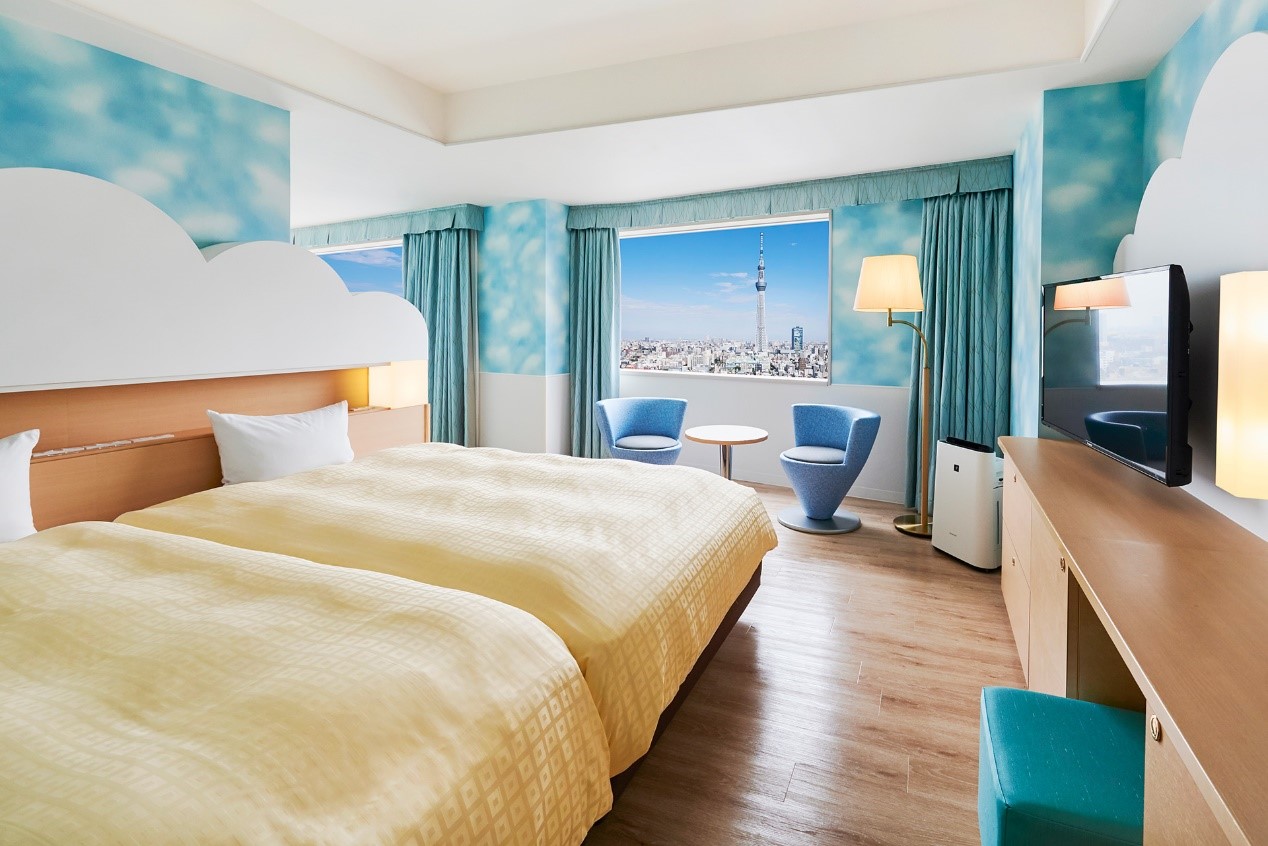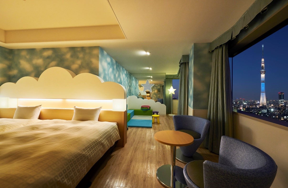 房內視覺設計以可愛的藍天白雲為概念,還設置許多玩具的兒童遊戲區,讓孩子獨享專屬遊樂空間,安心愉悅地感受住宿的趣味。飯店地理位置極優,鄰近東京晴空塔,住宿夜晚窗外望去壯觀的晴空塔夜景盡收眼底,在隅田川花火大會時還可見到美麗的煙花綻放,白天搭電車到晴空塔所在的押上站只需 3 分鐘車程,安排孩子登上晴空塔一覽壯闊的高空景觀之外,水族館、星象館也值得一遊,當然在晴空街道盡情購物也是一大樂趣。另外也可以參觀傳統工藝之美的「江戶切子館」,或是帶孩子們體驗水上巴士暢遊水景等。