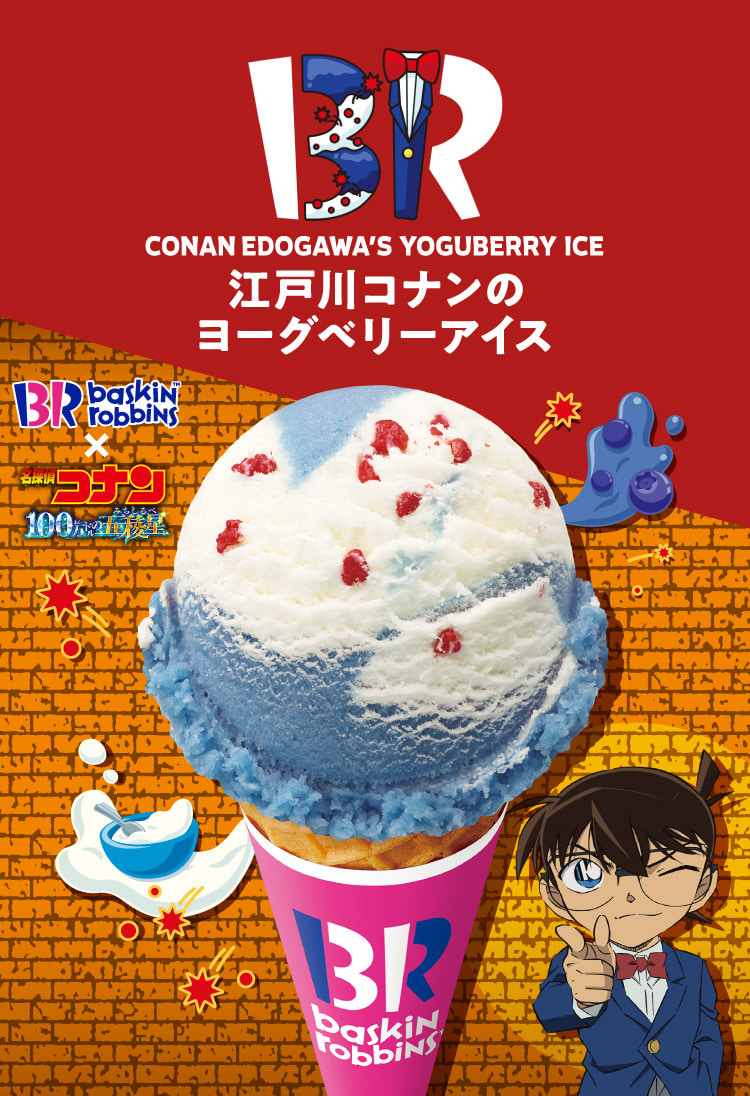 柯南的代表性服裝就是藍色外套搭配白色襯衫,並配上紅色領結,所以31冰淇淋以白色的濃郁優格做基底,搭配藍莓,最後用紅色跳跳糖當點綴,呈現柯南的形象,嚐一口便能得知真相的美味!