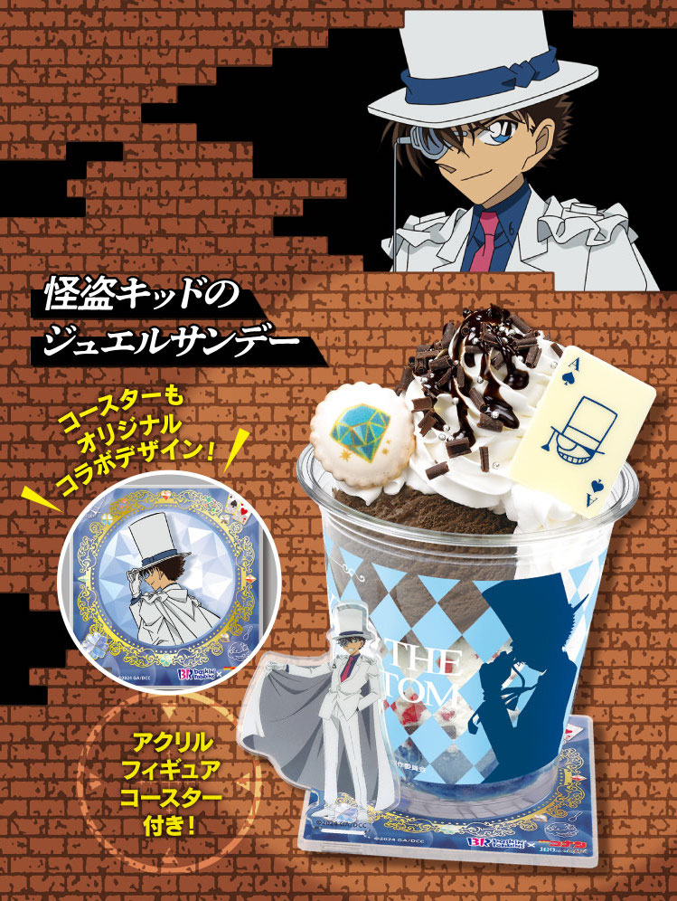 自由選擇兩球冰淇淋(small ),由店員淋上符合怪盜基德形象的白色奶油,搭配怪盜基德標誌圖樣的紙牌巧克力,最後以寶石圖案的糖霜來點綴,就讓怪盜基德聖代來擄獲你的芳心吧!