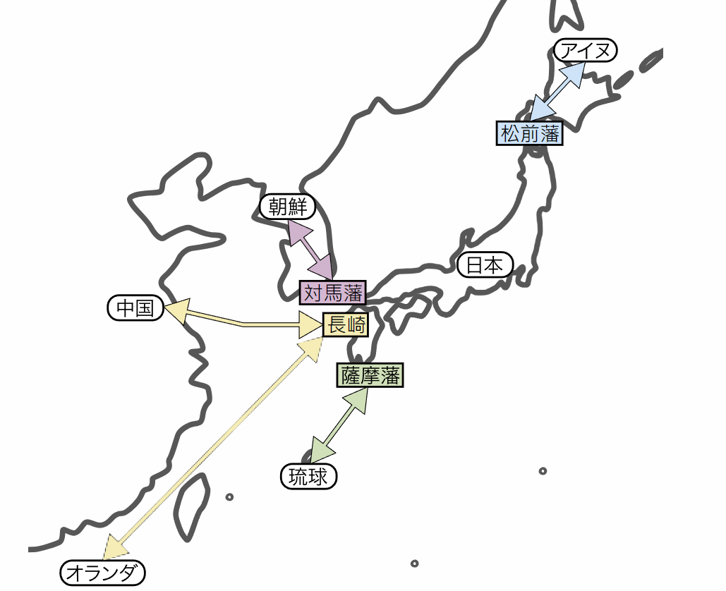 首先,與朝鮮的外交接口在日本西方的對馬島上,而當時的琉球王國的外使則是必須到薩摩,也就是現在的鹿兒島。和居住在北海道,當時還沒納入日本版圖的阿伊努人(當時稱為蝦夷)則是在北海道最南端的松前來往。至於和明朝以及荷蘭,則是在目前的長崎進行貿易及往來。
