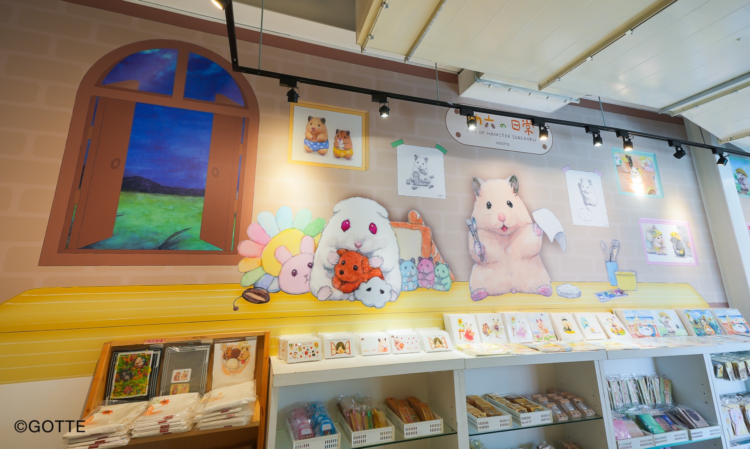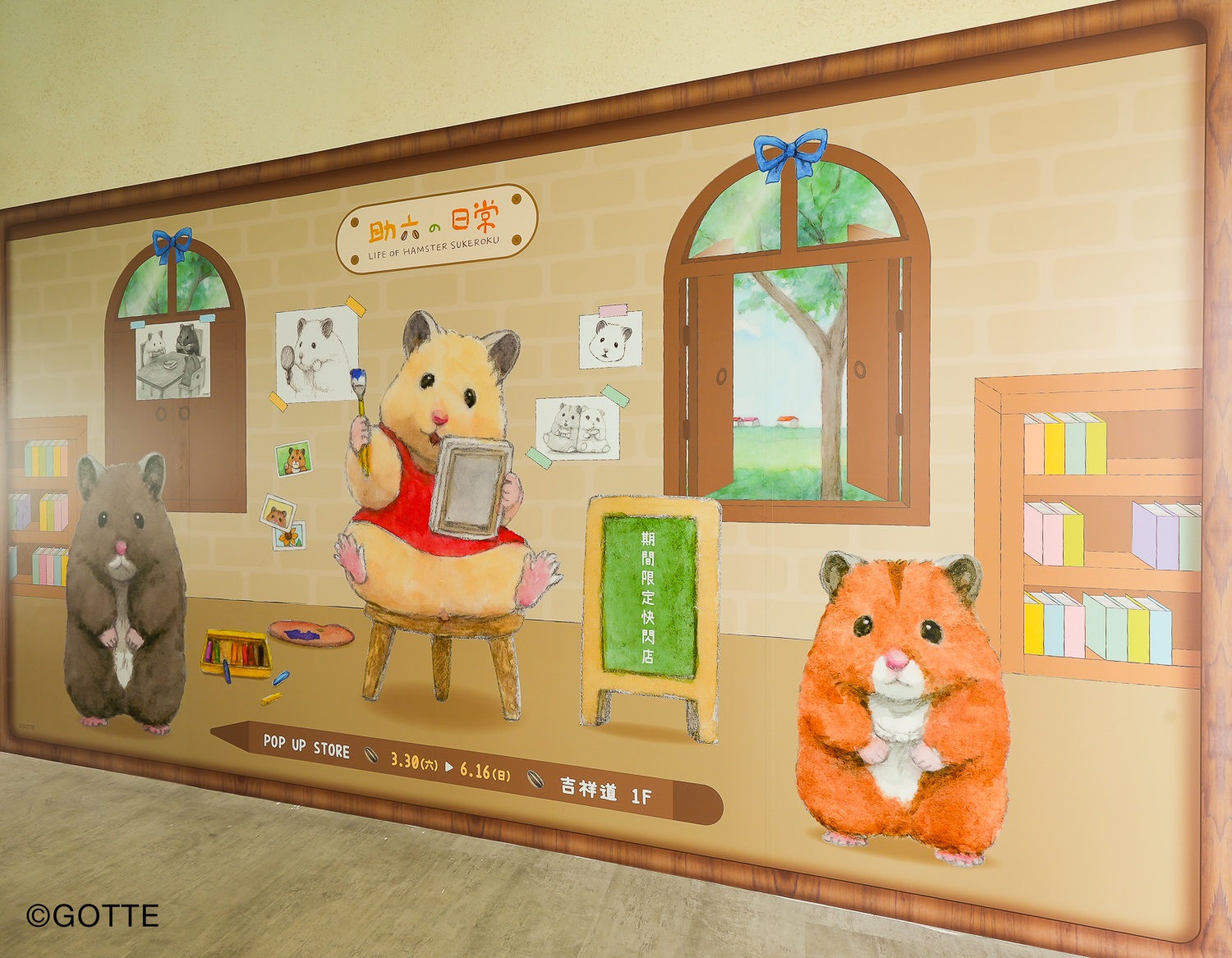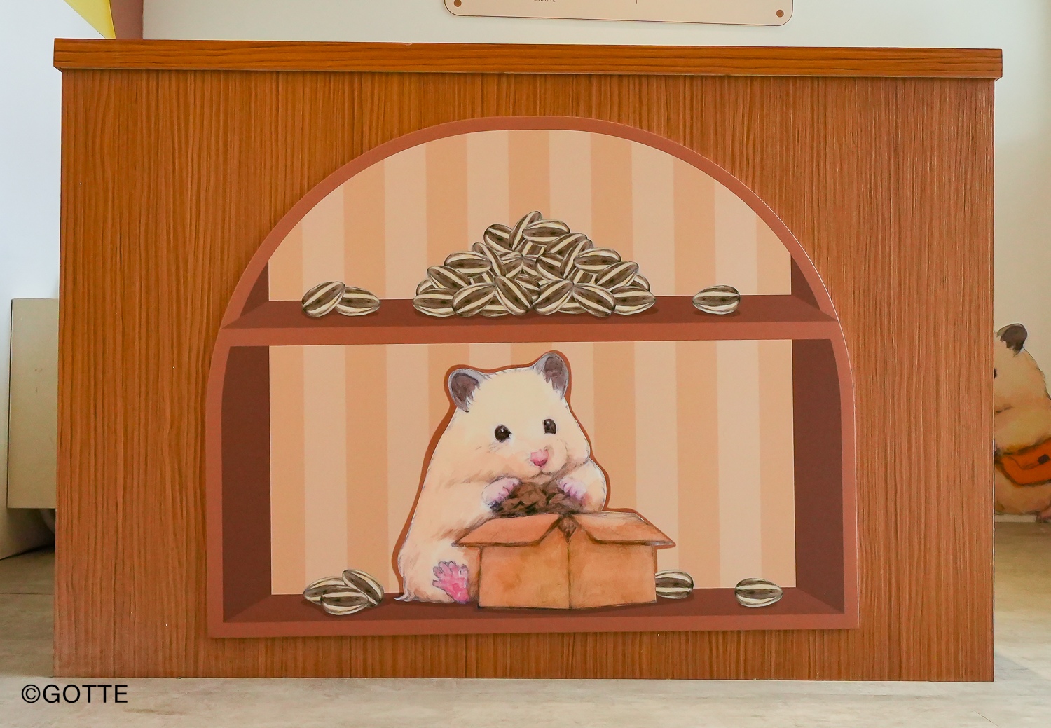 接著「喜洋洋上學中」的助六開心展示他的素描作品,還有小夥伴抱著娃娃午休的可愛模樣!其中還有相框中掛著小助六帶著小學黃帽第一次去學校、種植物的種種兒時回憶,看小助六從小長大福氣滿點!往右則是「開運修學旅行」,不管是當小農夫在田野實習、或是和小夥伴去遊樂園搭列車冒險的助六,各種陪你日常遊玩去!最後來到櫃檯前的「助六吉祥豐年祭」,看助六搜集好久的成堆種子,祝福大家這一年都能豐衣足食唷!