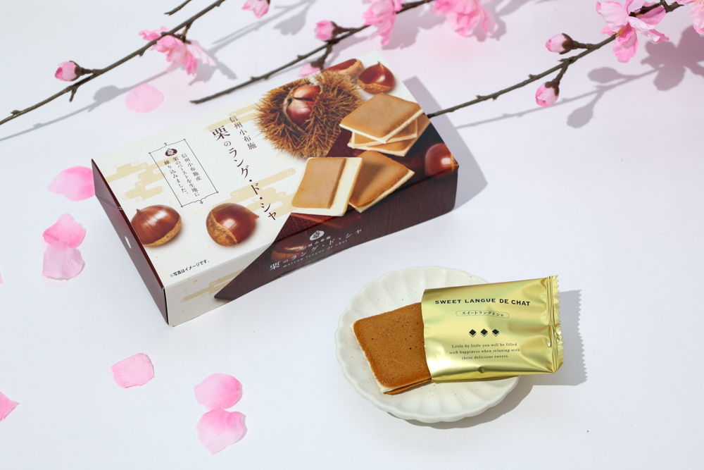 點心禮盒中第一個最大亮點是去年獲得JR東日本東京伴手禮大獎(長野、新潟、山梨)冠軍的超人氣點心——信州小布施 栗子貓舌餅(信州小布施 栗のラングドシャ)!這也是他的首度海外登場,長野縣小布施町以「栗子之鄉」聞名,這款貓舌餅將栗子醬混入麵團中,經烘焙後夾入香濃白巧克力,打開包裝就能夠聞到一股特有的栗子奶香,五感上都能感受到栗子的存在感,是非常特別又精緻的一款甜點!