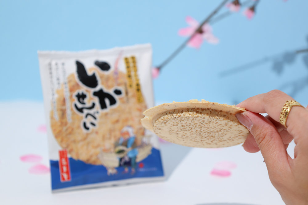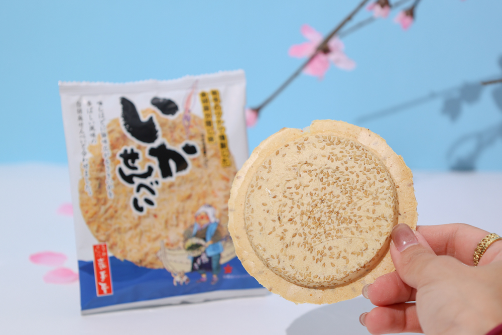 岩手縣向來以魷魚而聞名,這款仙貝加入了烤過充滿香氣的金色芝麻,以特殊的形狀乘載著職人烘烤岩手縣產魷魚粉,從氣味到口味與口感通通都給人耳目一新的饗宴。