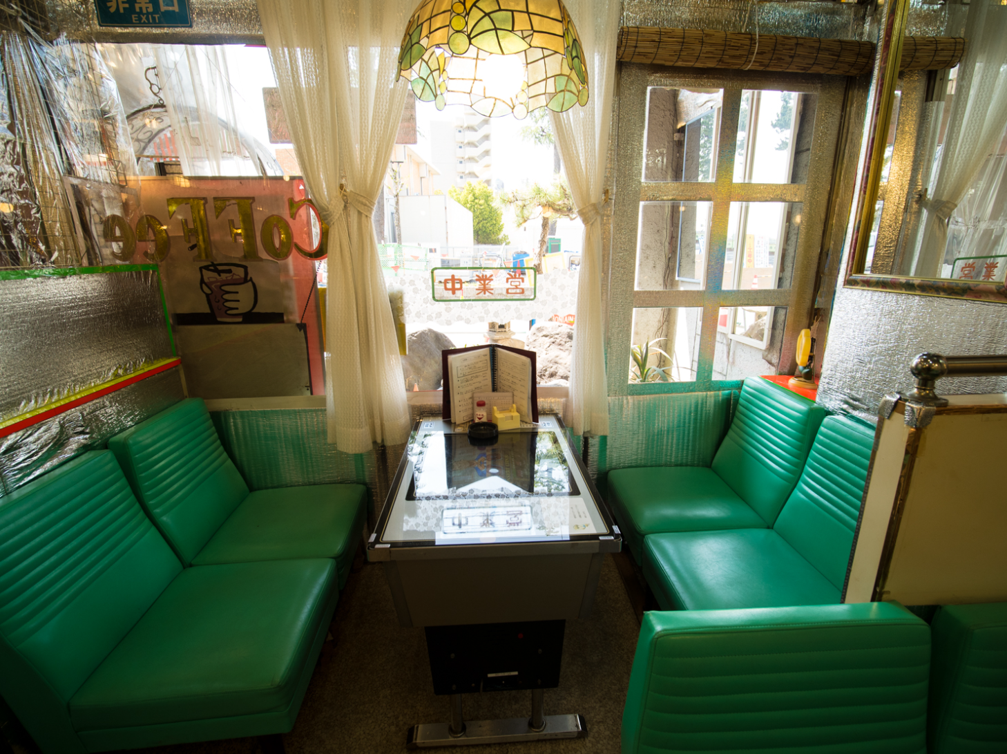 貌似80年代的舞廳,閃亮亮的裝潢、亮眼的綠色座椅、電子日式麻將的餐桌,這麼一個叛逆喫茶店座落在岡崎樸實的街道上。因為懷舊鮮豔的裝潢風格,吸引了許多年長的喫茶客,但現在因為流行千禧年的復古風潮,越來越多年輕人來體驗昭和時代的浪漫。
