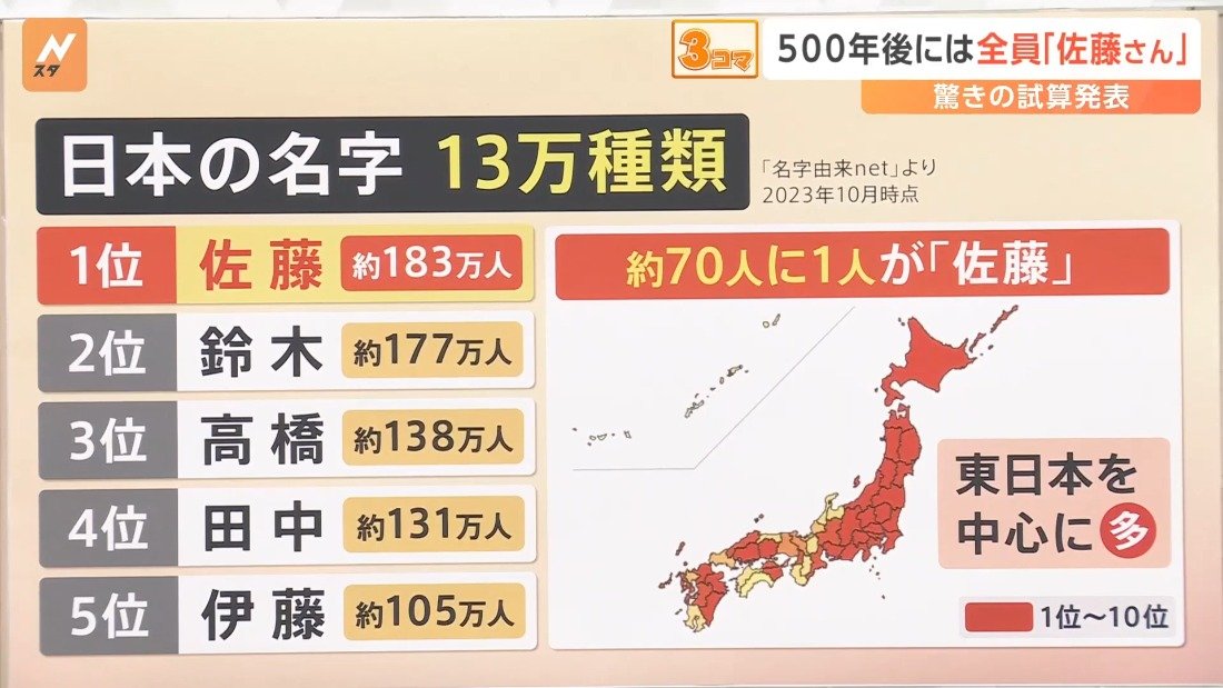 讓我們省去繁雜的理論過程,直接來說說結論吧!由於目前的少子化以及夫妻同姓制的制度,以及日本最多人擁有的姓氏就是佐藤。因此在結婚時雙方必定會有一方的姓氏被更改的情況下,擁有最大基數的姓氏的占比會逐漸增加,而少子化更是加速了這個趨勢。也因此當這項研究發表時,日本社會也再度地掀起了是否該維持夫妻同姓制的討論。