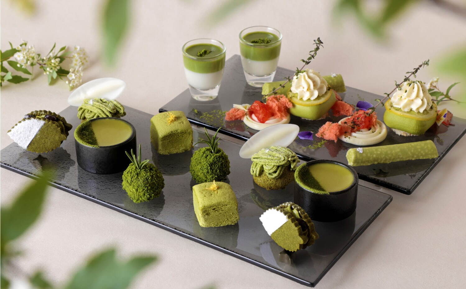 大家有沒有見過以和風景觀為主題,宛若藝術作品般的甜點呢?以「苔玉に見立てた抹茶ムース」(暫譯:苔球外觀的抹茶慕斯)為首,以鹿威的外觀為概念,放入了甜點的「抹茶のなめらかプリン」(滑順抹茶布丁)以及模擬出了枯山水那纖細模樣的「抹茶とレモンのケーキ」(暫譯:抹茶和檸檬蛋糕)等甜點在擺盤上描繪出了日本的傳統之美。