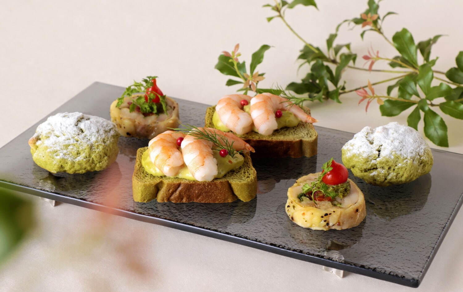 說完了單純的甜點,接著讓我們來看看以春天的綠意盎然為主題,有著嶄新概念的料理吧!首先是上頭放有蝦仁的「小エビとアボカドの抹茶のブルスケッタ」(暫譯:迷你蝦仁與酪梨抹茶的普切塔),結合了海鮮與抹茶的普切塔無疑可以讓人品嚐到嶄新的滋味。使用了香草提振雞肉香氣的「ハーブチキンロール」(暫譯:香草雞肉捲)更是令人食指大動。最後,將各種美味的要素結合,將口味提升至了另一種層次的美味的「抹茶と小豆とホワイトチョコのスコーン」(暫譯:抹茶、紅豆、白巧克力的司康)相比另外兩道料理也毫不遜色。