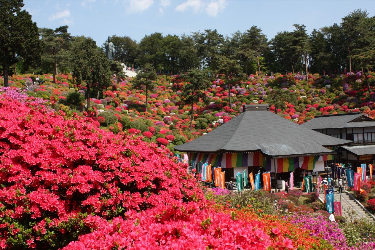 東京青梅市鹽船觀音寺為具有三千年歷史的古剎,與其歷史齊名的,就是四季盛開的繽紛花卉了,因此有『花寺廟』的美譽。而春季以滿山谷一球球色彩交織的杜鵑花絕景著稱,更被列為「東京新百景」。
