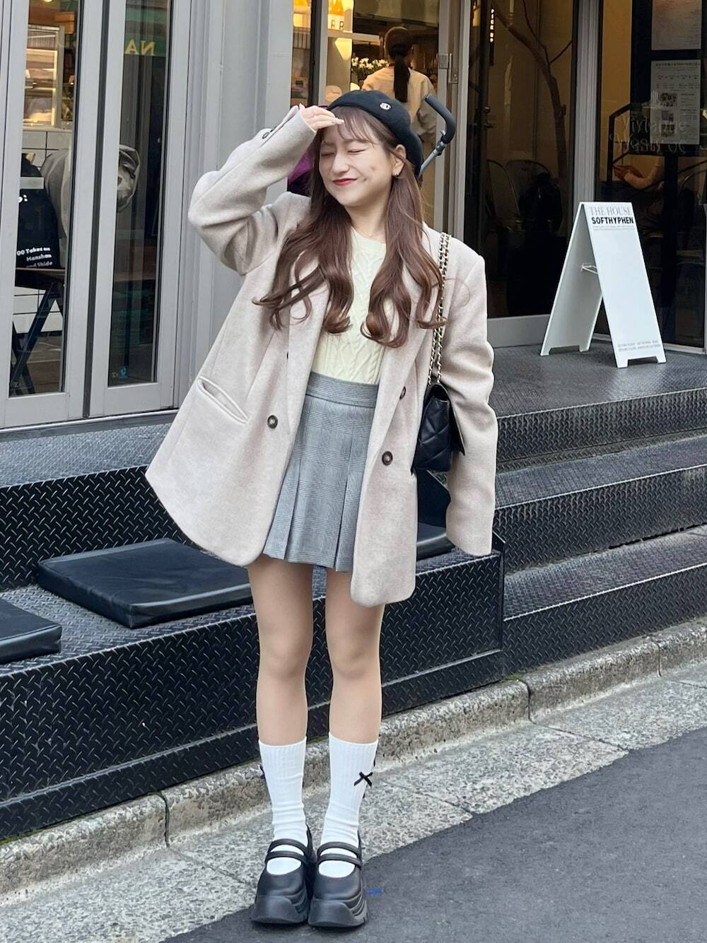 喜歡日系輕甜風格的大家,其實西裝外套也能穿出甜美氣息,不妨嘗試以成套西裝外套混搭,例如灰色西裝外套 + 灰色短裙,將同色系單品混合,連結個性兼具的時髦質感,換上燕麥色西裝外套與寬百褶短裙,再隨性戴上貝蕾帽,不僅為衣著注入一股年輕活力,還能製造滿分的女孩感 Look 。