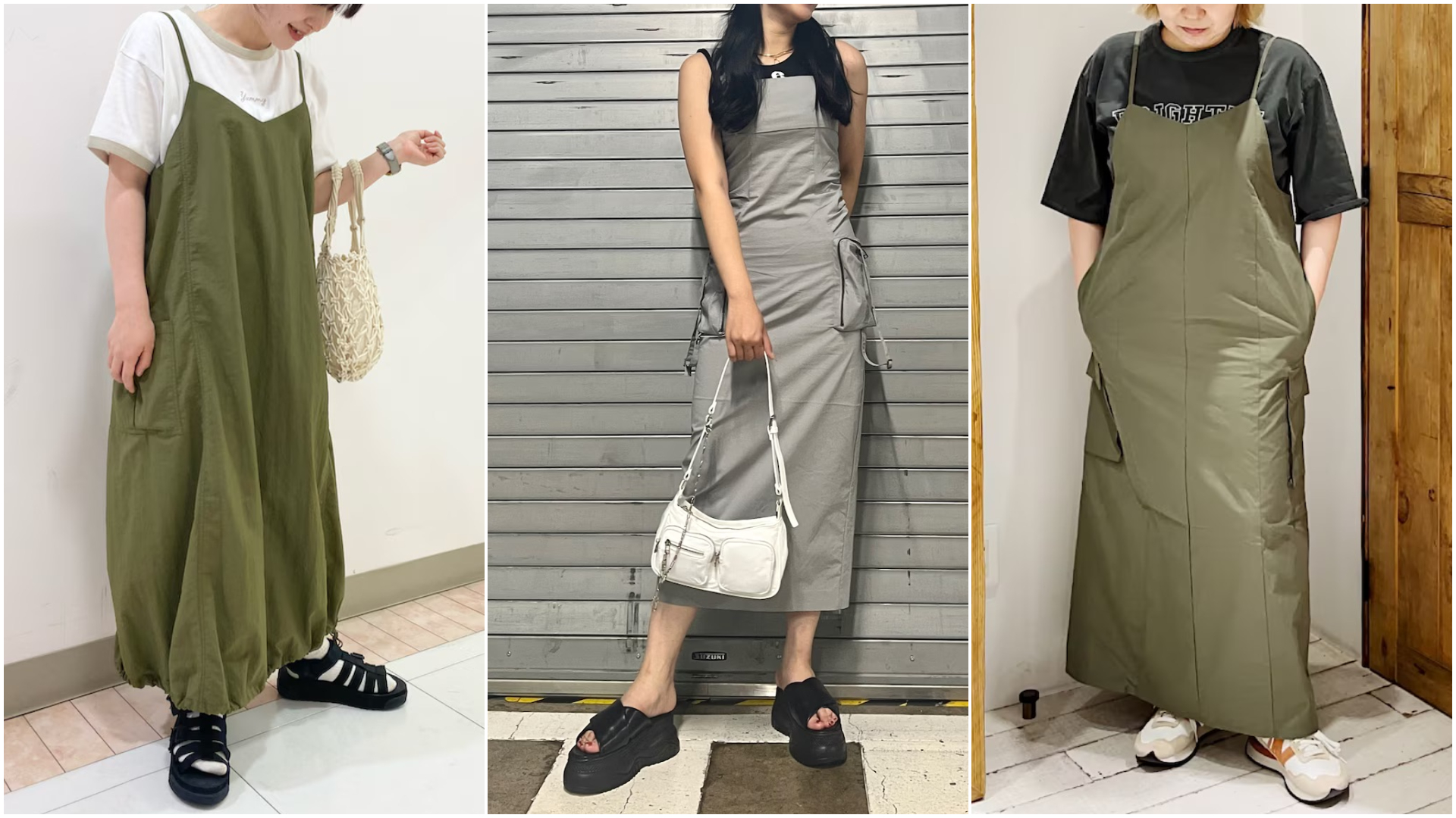 工裝吊帶裙是非常容易上手的一件單品,不僅非常舒服可以迅速搭出一天好看的穿搭,因此選好一件符合自己身形的工裝吊帶便是很重要的功課,若是骨架比較小比較瘦的話,可以選擇下擺抽繩的球狀款式,看起來比較有份量,也很可愛;但若是高個子女生則建議穿著比較有線條的工裝裙,不會看起來太笨重也能把比例好好的展現出來。裡面搭配的上衣則可以根據天氣或是喜好來變化。