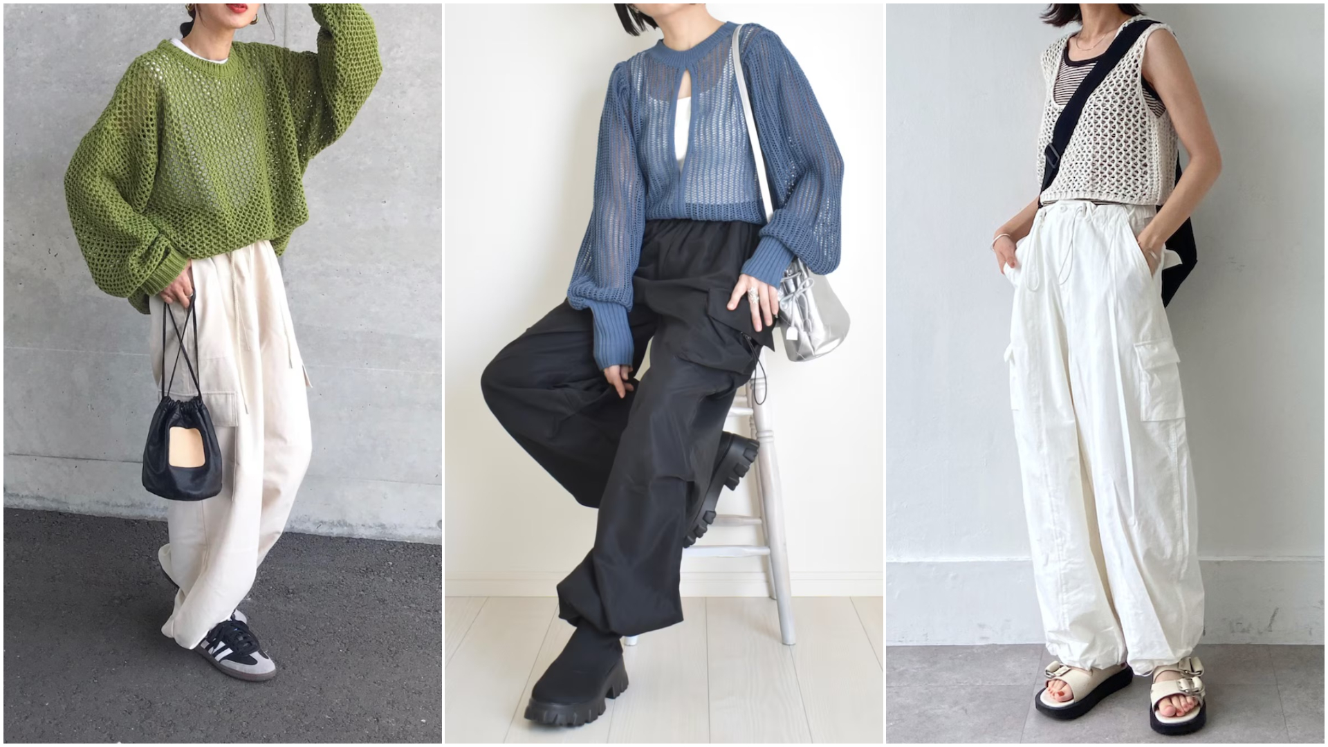 近幾年網格上衣非常流行,是日系女孩們衣櫃裡必備的一件萬用單品,而鏤空針織的上衣搭上尼龍或是棉的工裝褲也十分個性時尚,誰說穿著工裝一定是中性帥氣,配上網格上衣讓肌膚若隱若現,顯得個性甜美。功能方面,長袖的網格上衣既可以遮陽又不會過於悶熱,和工裝褲一樣,一年四季至少可以穿三季,如此高cp值的搭配很值得收藏。