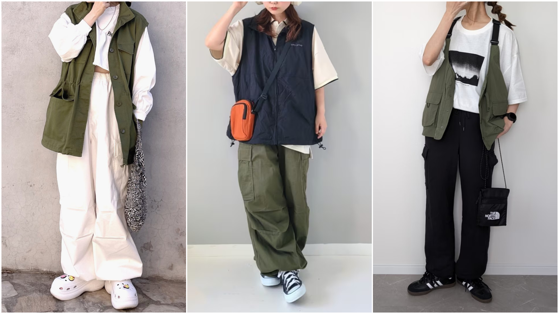 工裝背心的穿搭技巧很多樣也實用,搭配上工裝褲和運動鞋,打造出休閒舒適的街頭風格,而日系女孩最擅長搭配的就是「層次感」,因此在背心跟上衣的搭配上是一門很大的學問。但最容易的方式還是從袖子寬鬆的上衣入手比較不會出錯喔!
