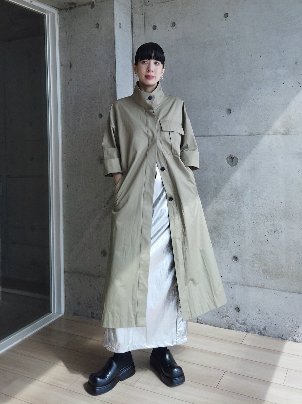 如果平時喜歡以裙裝表現穿搭,不妨嘗試以卡其色風衣 + 長裙,傳達優雅女孩的日系焦點,選擇直線剪裁的卡其色風衣,修飾版型能讓身形看起來顯瘦又顯高,下半身運用緞面材質長裙,能使衣著傳達高級質感之外,還可為春季造型增添滿分造型魅力。