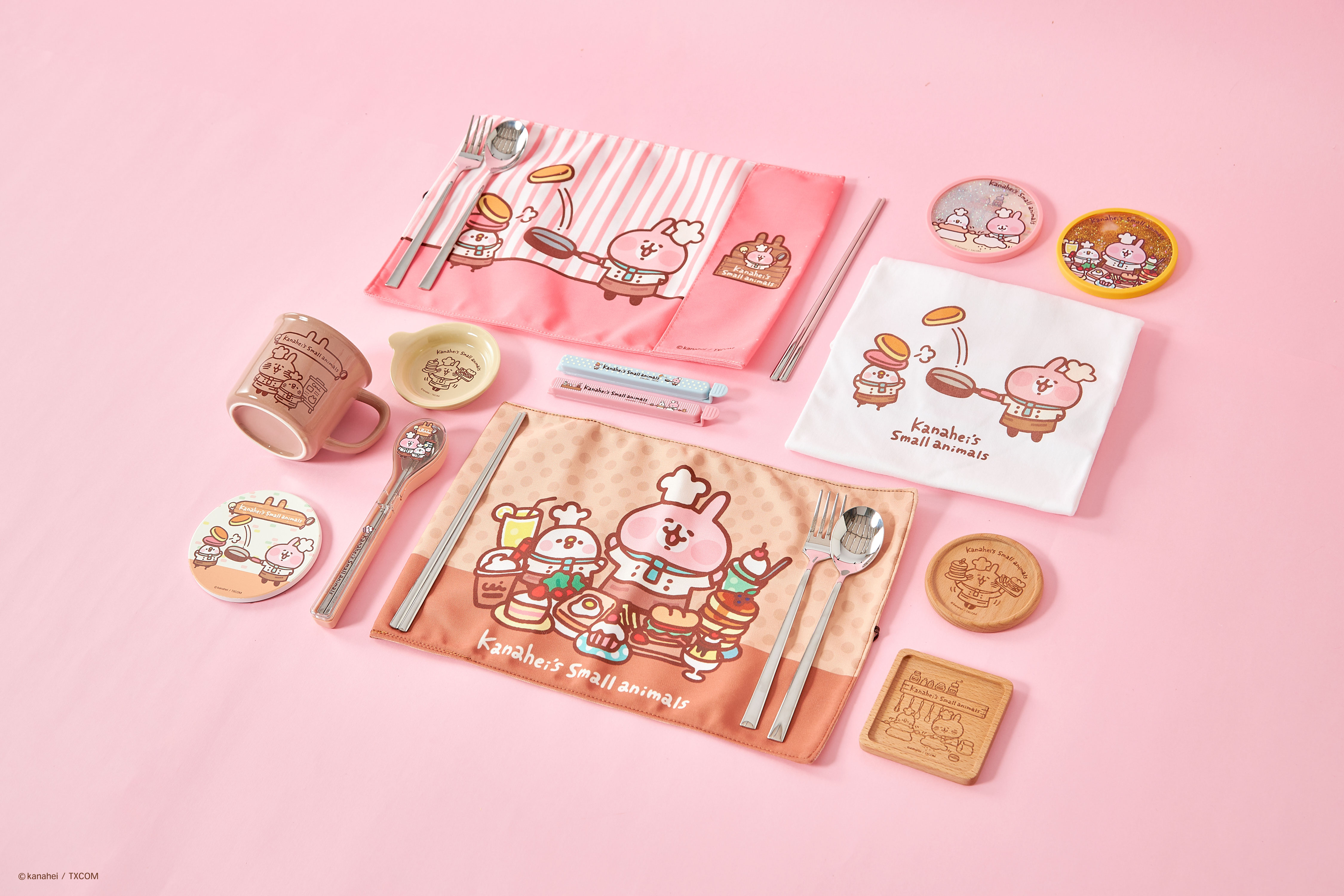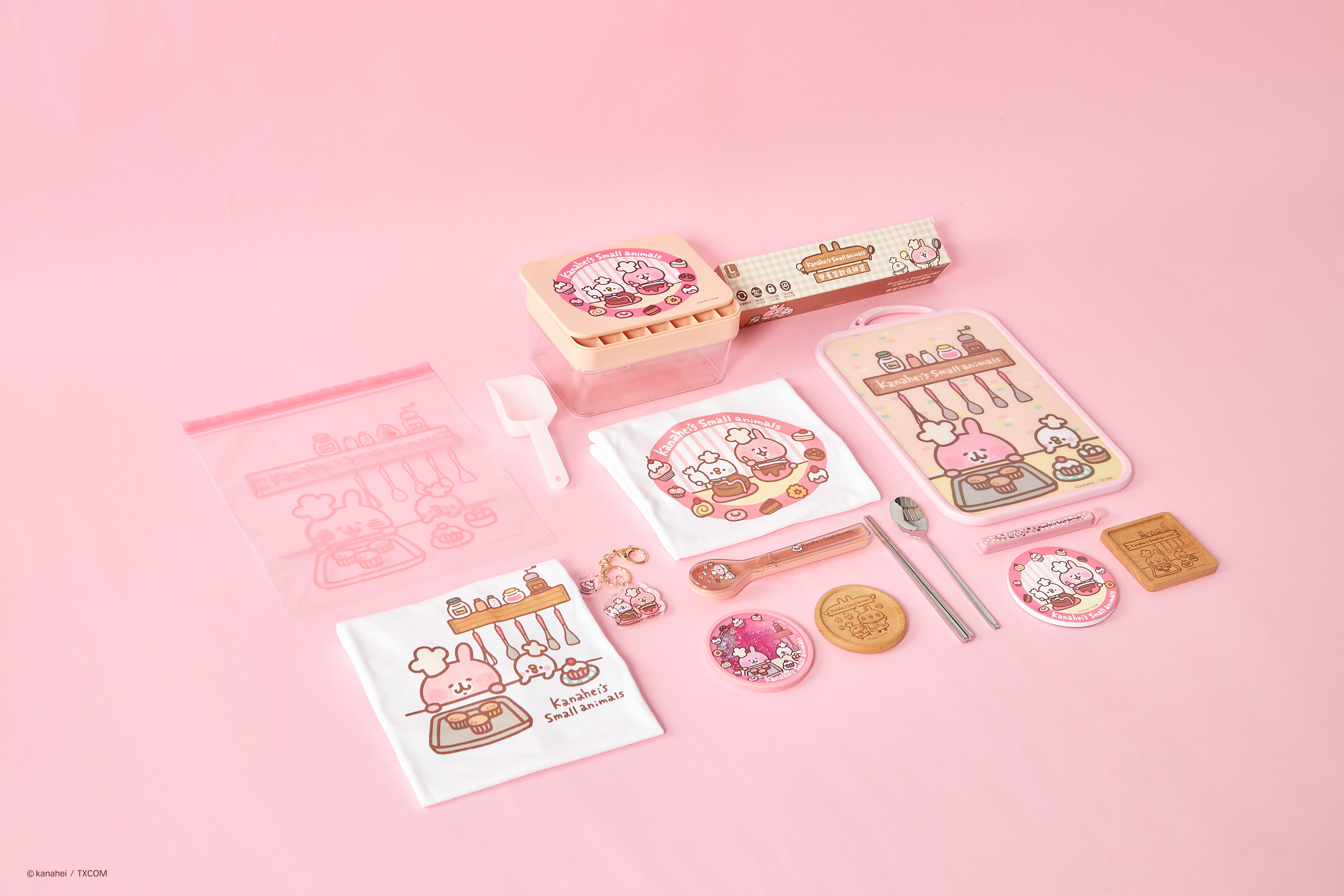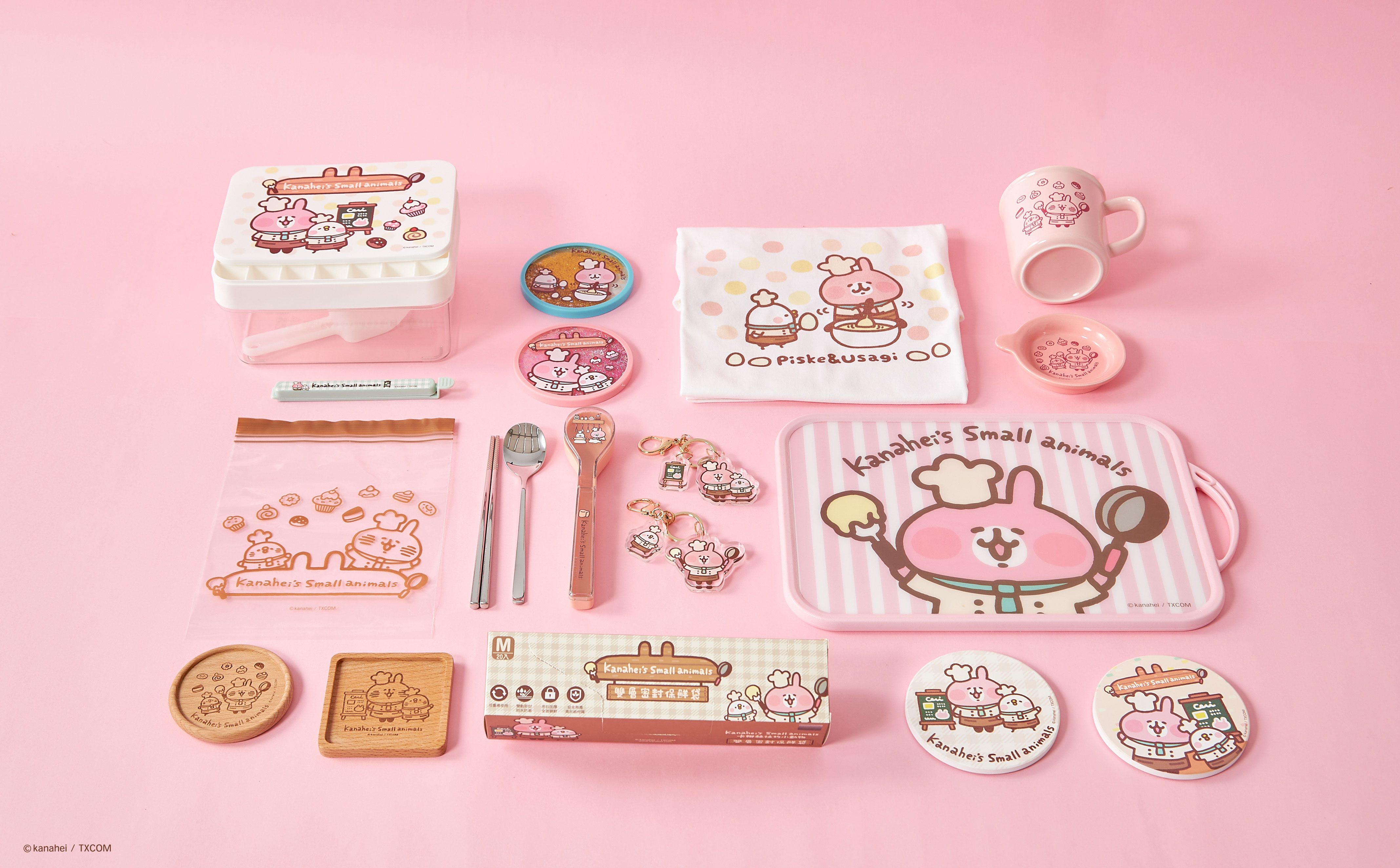 跟著P助與粉紅兔兔做甜點 這系列有粉紅兔兔端出剛出爐的杯子蛋糕的「廚房二」設計,推出切菜必備「砧板」、收納好物「雙層密封夾鏈袋」及讓你桌面不濕濕的「流沙杯墊」等廚房好物等你收。還有粉紅兔兔攪拌著巧克力醬、P助在裝飾蛋糕的「甜點」圖案,從讓你輕鬆在家做出清涼冰塊的「製冰盒」,到出門自備「環保餐具組」及掛在包包上隨時看了都好療癒的「鑰匙圈」等周邊,最後在穿上「T-shirt」做出你的獨家甜點吧!
