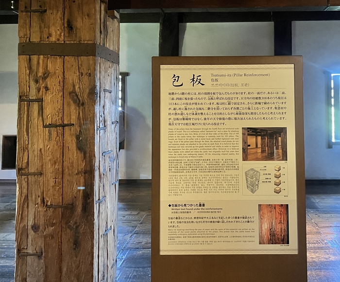 松江城天守閣保存與規劃得非常好,每個建築的小細節,都有詳細的圖片說明與空間介紹,像是貫穿樓層的大木柱、使用木板+鐵圈固定包住的「包板柱」,以及每層不同的構造與樓梯設置,很值得花時間慢慢看慢慢逛。