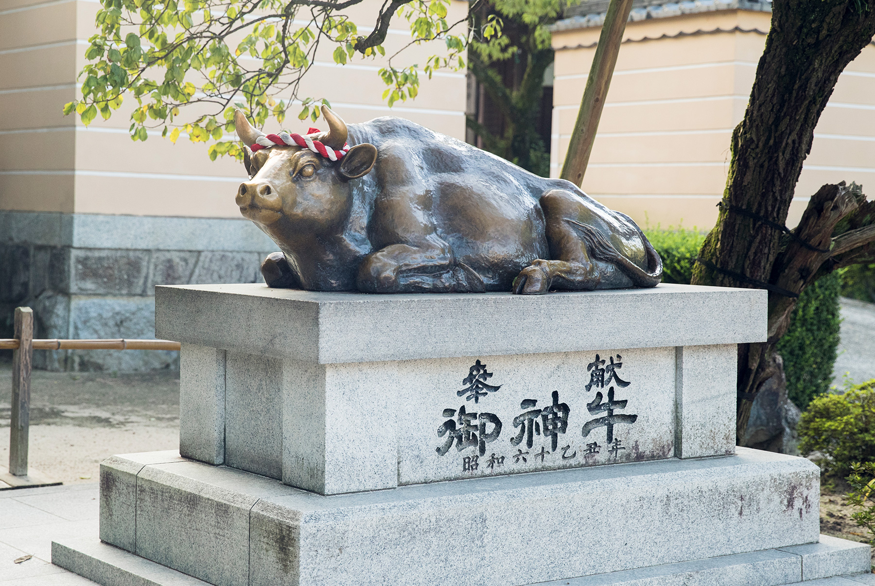 牛在太宰府天滿宮有著特殊的意義。相傳菅原道真去世之後,公牛拉著載有其遺體的拖車,拉到一半突然躺在路上,不願挪動。於是菅原道真的追隨者只好當場將他埋葬,該處正是今天御本殿(主神殿)的所在地。菅原氏被奉為神祇後,無數的遊客歷來紛紛捐給神社御神牛的雕像,目前神社裡共有 11 座,放在神社各處。最大的一座銅製雕像,位於代表神社入口的鳥居旁,不少訪客來此都會輕拍牛頭,祈求變得更有智慧。經年累月下來,牛頭因此變得閃閃發亮。