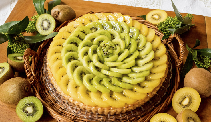 將甜美多汁的奇異果鋪滿在塔皮表面,搭配香脆蘋果製成的慕斯。黃色與綠色奇異果和淡粉色的慕斯相互搭配,不僅適合拍照,明亮的配色也讓人看了食欲大增。