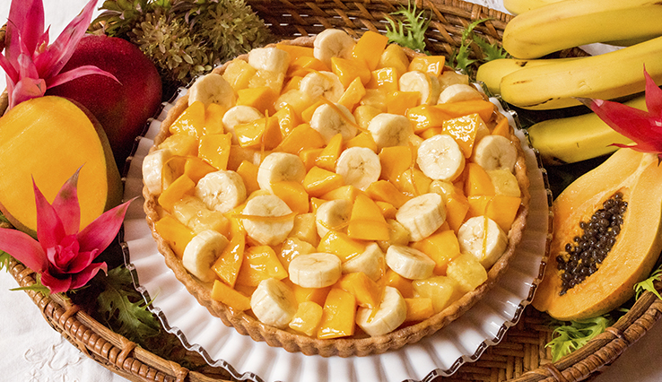 使用椰子風味的卡士達奶油為基底,點綴著鳳梨、木瓜、芒果和香蕉等水果,打造出充滿南國風情的水果塔。