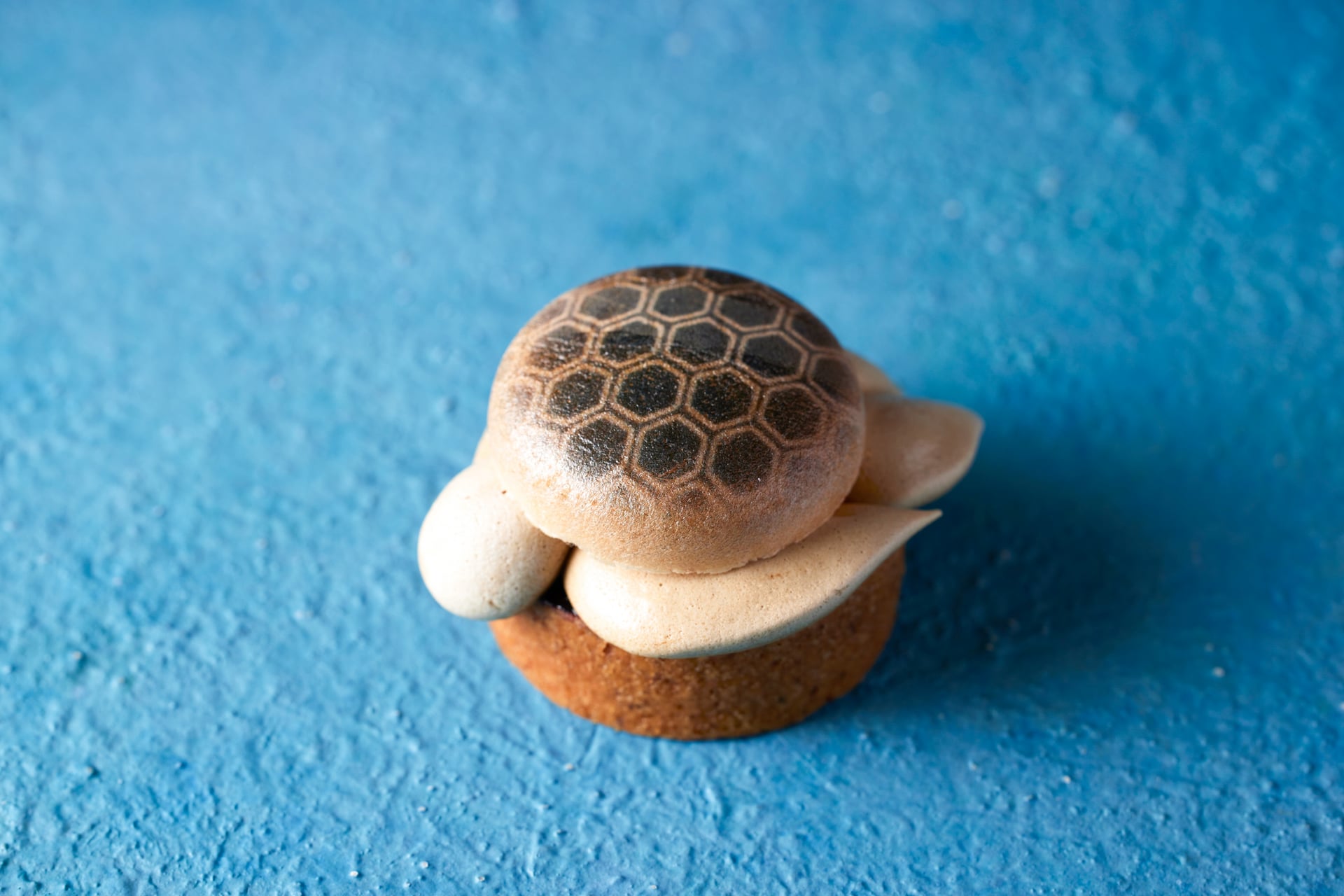 這是以墨田水族館精心培育的瀕危物種—小綠蠵龜寶寶為靈感的甜點,極具創意與美感。甜點中的奶油採用小笠原產的百香果製成,帶來濃郁的熱帶風味。製成小綠蠵龜的手腳的蛋白霜加入小笠原產的鹽,口感獨特,龜殼則用傳統日式點心最中製成,形象逼真。每一口都彷彿在品味大自然的恩賜。這款甜點不僅在視覺上栩栩如生,彷彿一隻小海龜躍然盤上,其獨特的風味更令人回味無窮。