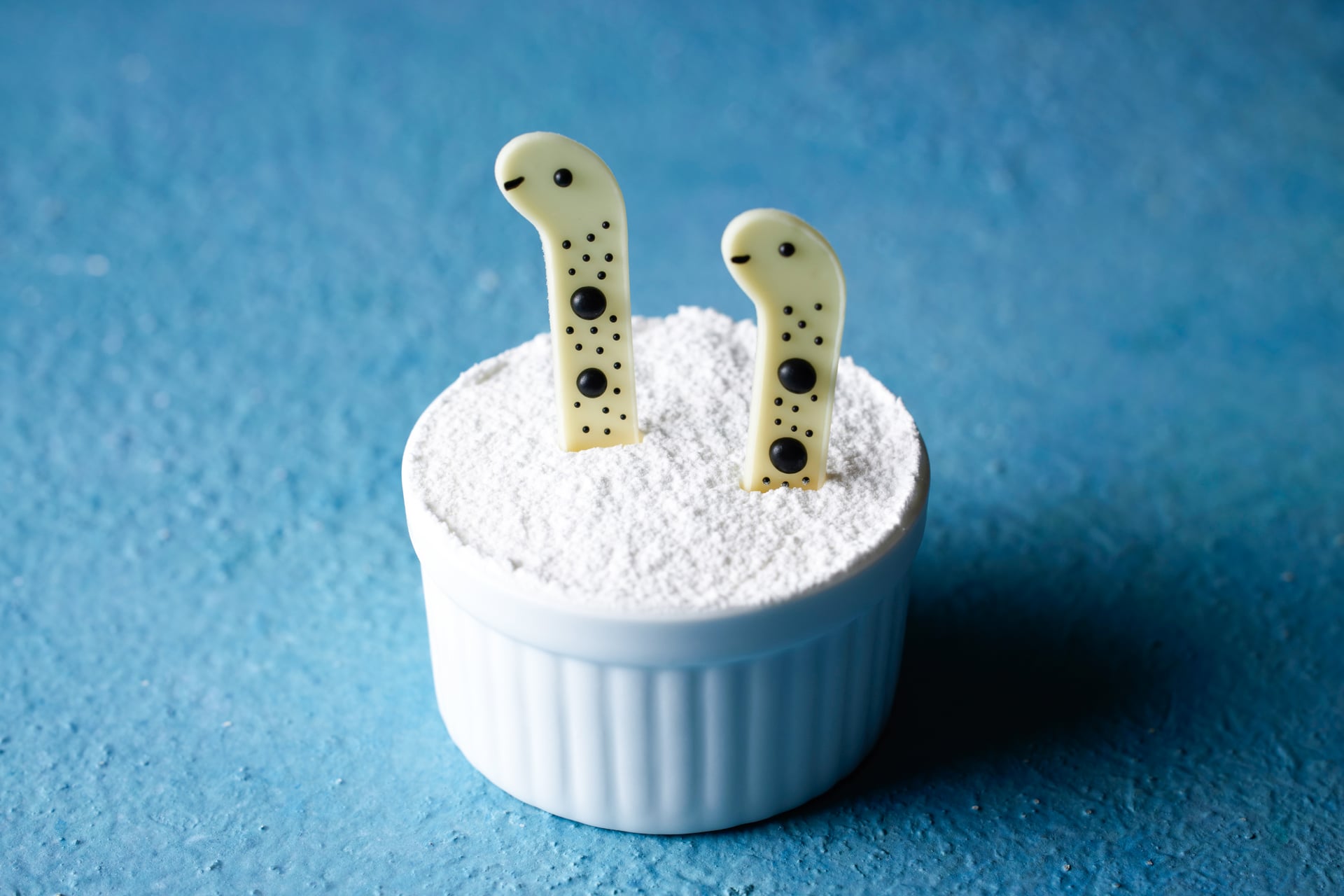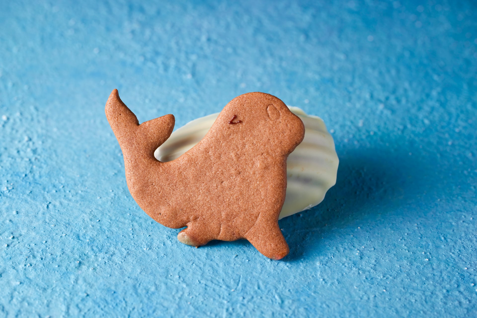 與貝殼造型的瑪德蓮一同出現的海獅,營造出彷彿在海邊滾動的可愛模樣。海獅是巧克力做成的餅乾,瑪德琳則使用了有機糖,塗上白巧克力裝飾,並加入了杏仁膏,使其口感濕潤且豐富,並帶有清新的檸檬風味。