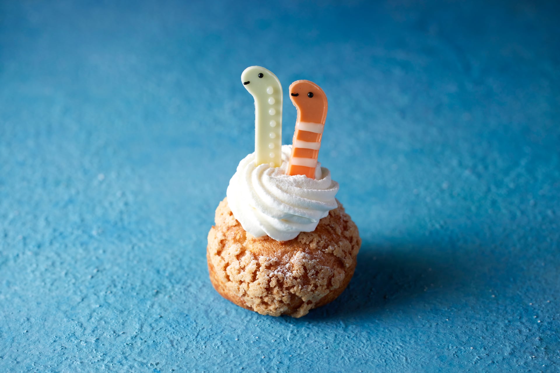 這是一款酥脆的餅乾泡芙,裡面填滿了鳳梨果醬和卡士達奶油,可以盡情享受新鮮甜美與濃厚奶油的絕妙組合。泡芙上點綴著從奶油中露出頭來的錦花園鰻和白點花園鰻,外觀十分可愛。