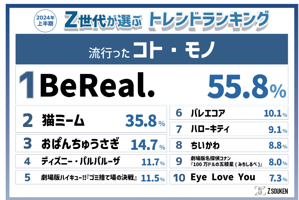 還記得之前「蛙化現象」這個詞嗎?意指心儀對象做出讓自己反感的事情,頓時好感全失,這是去年日本的流行語之一,這些流行語都是由「Z總研」票選出來的。Z總研是由N.D.Promotion株式會社經營的Nom de plume(ノンデプルーム)的讀者組成,主要由對潮流敏感的Z世代女生組成的Z總研獨有的真實Z世代社區成員進行趨勢調查,最近發布了《Z總研2024年上半年趨勢排行榜》。