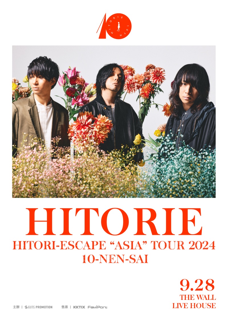 HITORIE亞洲巡演「HITORI-ESCAPE “ASIA” TOUR 2024 10-NEN-SAI」台灣場,將在2024年9月28日於The Wall Live House開唱,門票於6月8日(六)中午12點在KKTIX、全家FamiPort正式開賣,其中限量VIP票將可獲得台灣限定紀念徽章組,並於演出後參加簽名會。活動詳情請上Guts Promotion facebook粉絲專頁查詢。