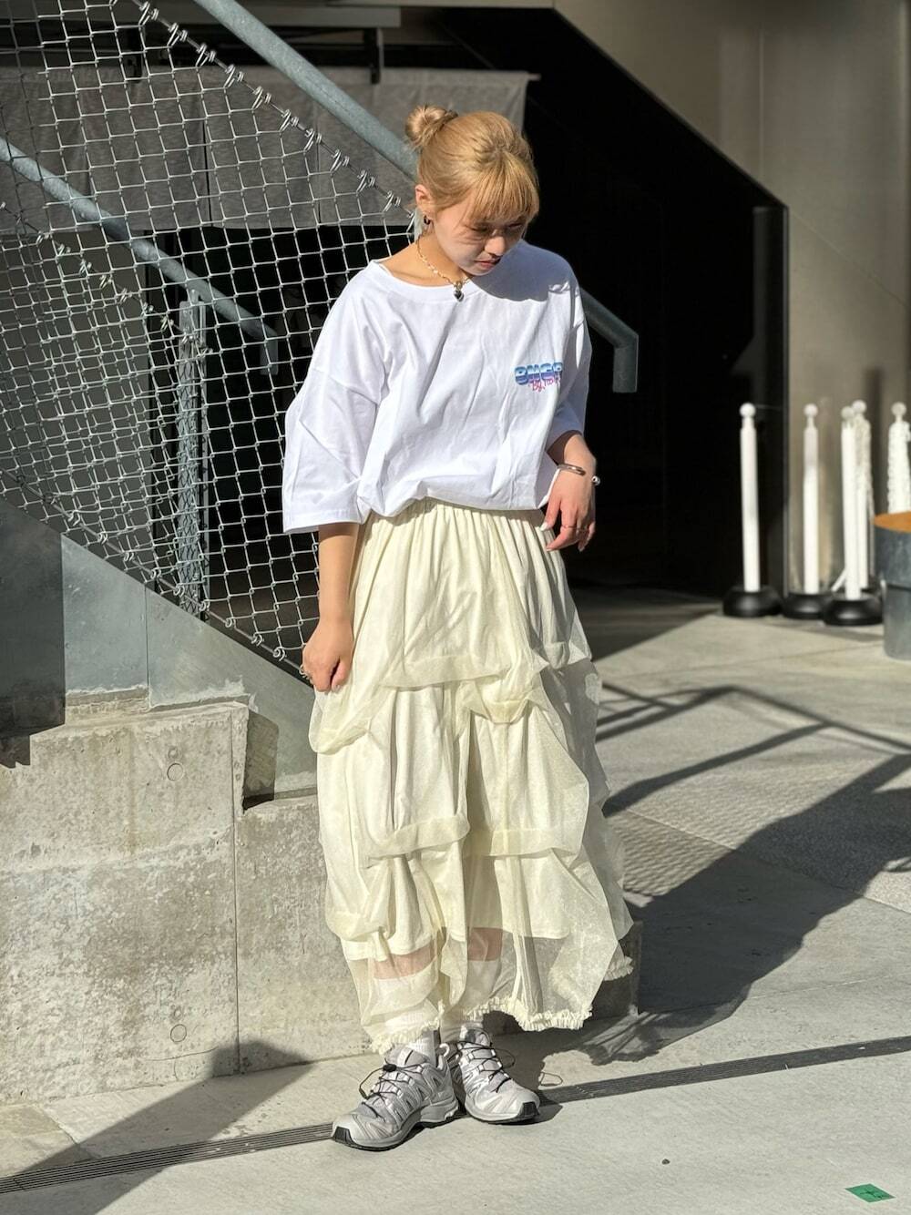 每個女孩衣櫃裡一定都有的拼接長裙,運用拼接與皺褶設計,穿著時會使整體散發一股氣質仙氣,當想分散既定造型感受,可以選用寬鬆或素色的 TEE 為搭配,為整體增加率性休閒的衣著感受,隨性穿上一雙球鞋就能快速上街。