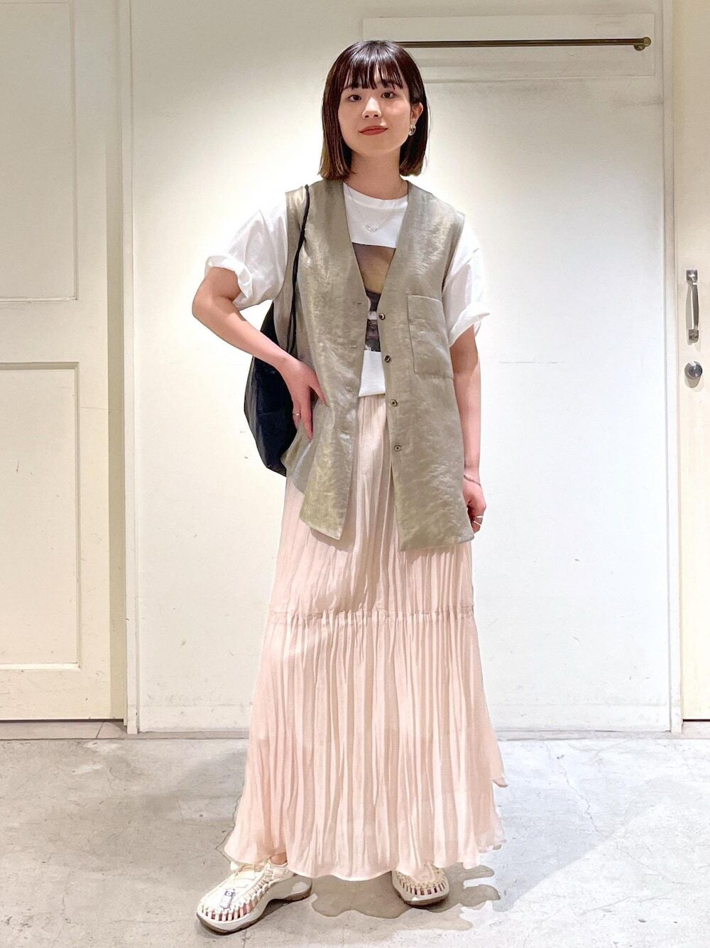 以壓皺感的皺褶裙,是近期日本女生外出不可少的超夯裙款,當懶得想穿搭時,一件皺褶裙輕鬆搞定時尚印象,上衣加上背心便可為衣著注入清爽舒適的夏日風格,如果想遮手臂的話,推薦內搭短袖上衣,兩種混搭組合不論上班或逛街都很合適。