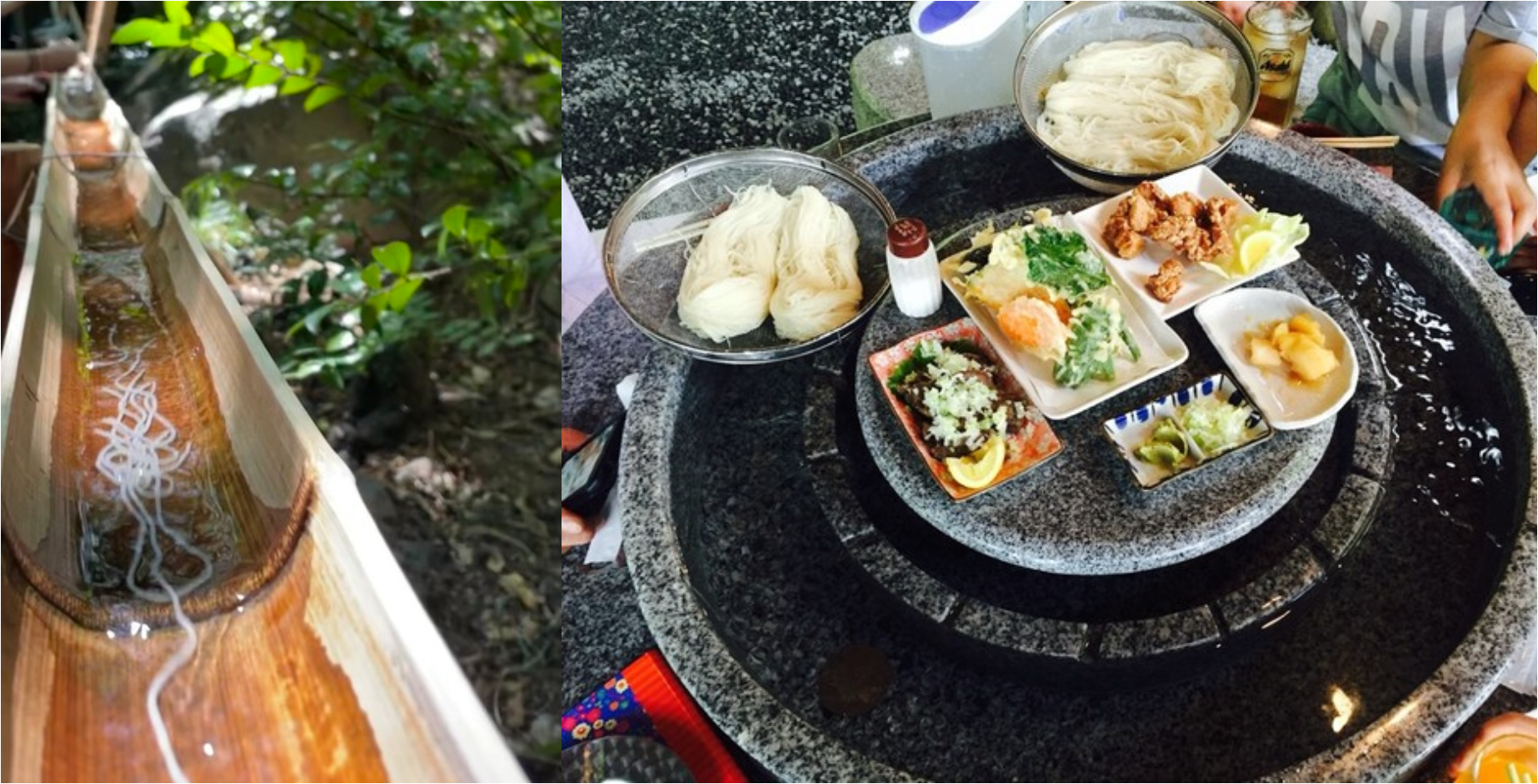流水麵,原文為「流しそうめん」,是一種利用竹管流水來享用麵條的獨特吃法。這種習俗起源於日本的山區,特別是京都和奈良地區。竹管內流淌著冰涼的清水,細長的素麵順著水流滑下,饕客們需要用筷子迅速夾起麵條,沾上特製的醬汁食用。這樣的體驗既充滿樂趣,又能在炎熱的夏日中帶來一絲清涼。