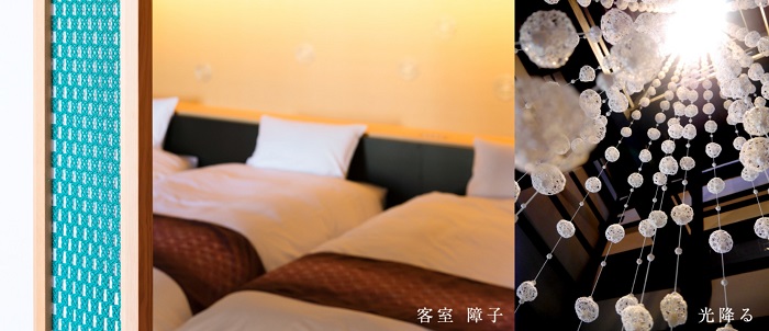 像是金澤知名溫泉旅宿「界加賀」的大堂,從樑柱垂下的優雅白色系「水引」裝飾,還有金澤東茶屋街的旅館「薪之音金澤」、加賀的「山中温泉 花紫」的編織牆都是出自廣瀨由利子的巧手。