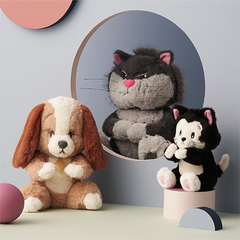 表情可愛且手感柔軟的絨毛玩具,令人愛不釋手。總共有三款,分別是「小姐與流氓」的淑女,「仙履奇緣」中的魯斯佛,以及「木偶奇遇記」中的費加羅,其中費加羅為網路商店限定販賣。