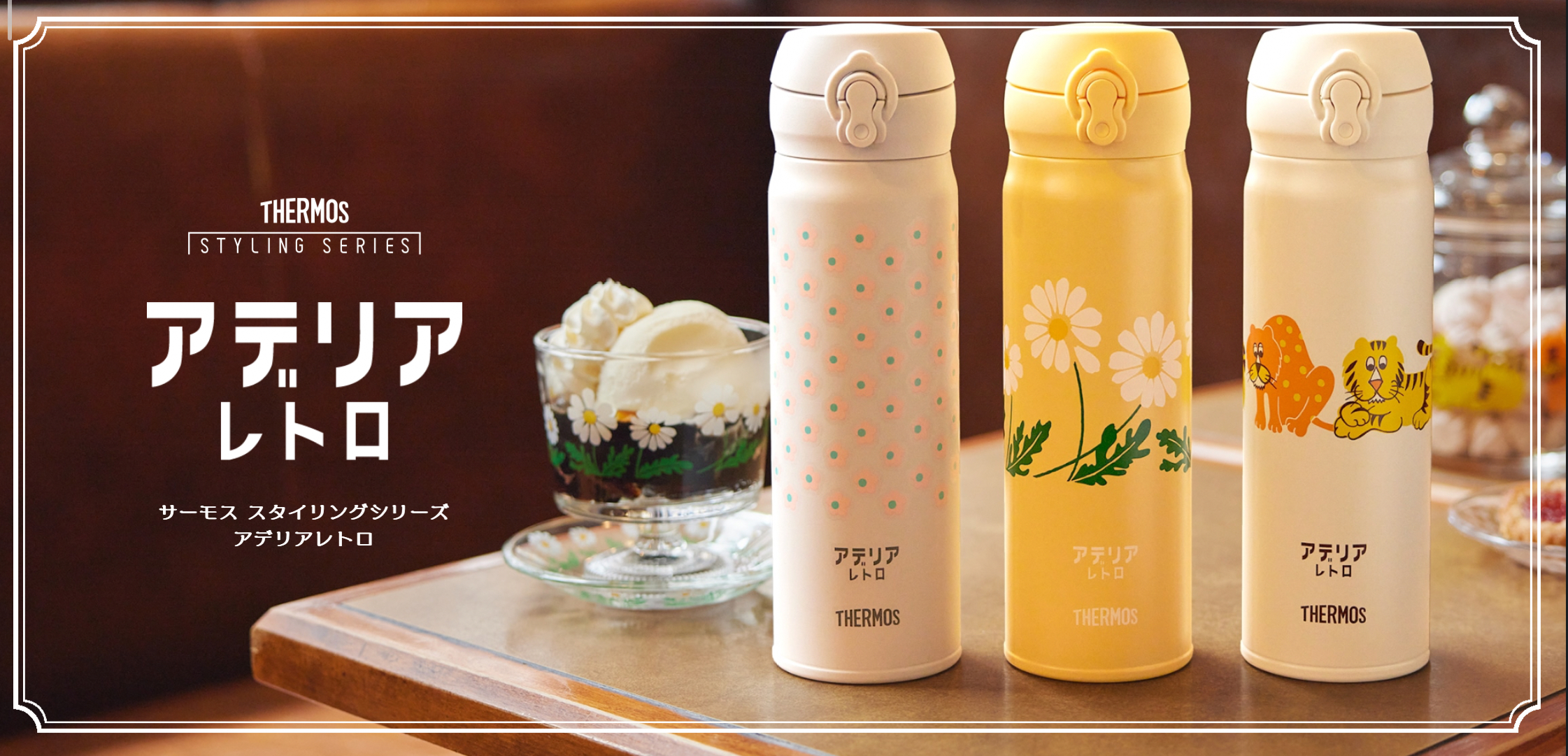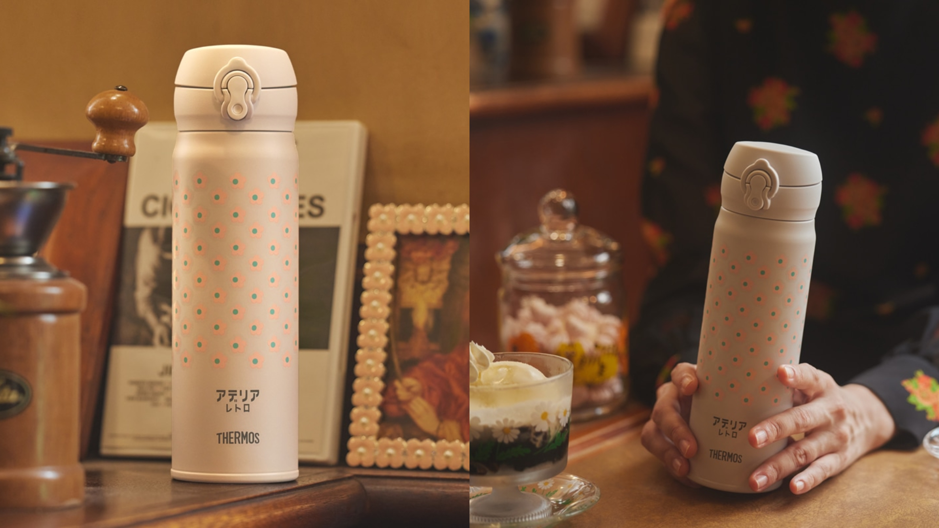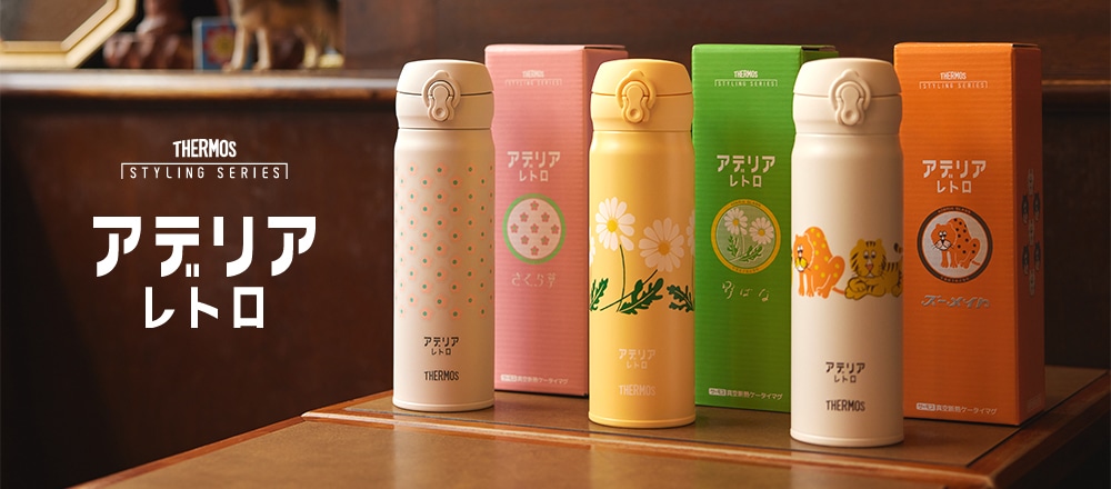 Adelia Retro系列一直大受雜貨控的好評,辨認度超高的昭和感復古印花款款都各有擁護者,這次在日本跟膳魔師THERMOS推出了三款聯名系列,最經典的輕量彈蓋式保溫瓶JNL-500分別換上了有質感的復古感顏色,準備用可愛收服粉絲的心。