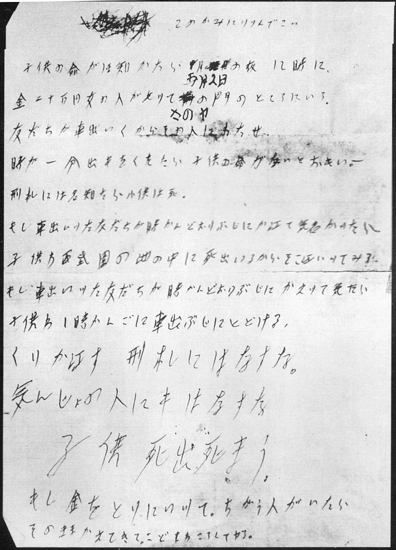 1963年51日,一名16歲的少女中田善枝在離開學校失蹤。她出身於當地的富裕農家,本來家族要在今天為她慶祝生日,不過,她在下午3點半左右離開學校後,卻遲遲沒有回家。擔心的哥哥出門嘗試尋找,但也沒有任何收穫,在晚上720左右回到家後,卻發現玄關有一封白色信封。裡頭放著中田善枝的學生證以及勒索信件,要求中田家要在明天晚上12點於指定的地點交付20萬日圓贖金,並且不許報警,若是中間出了任何差錯,少女的屍體就會出現在西武園的池子內。